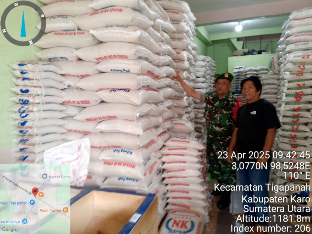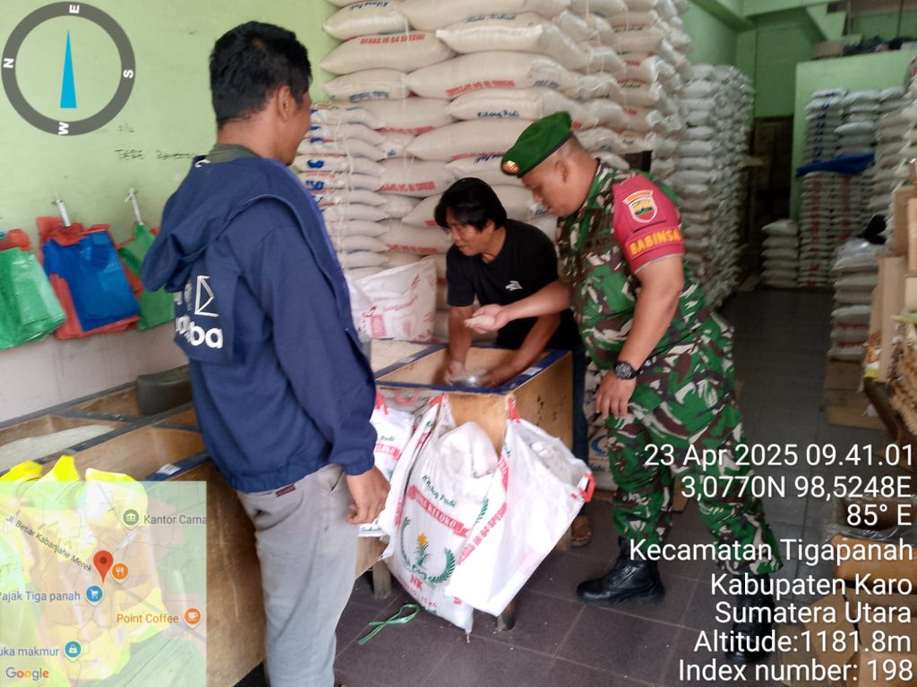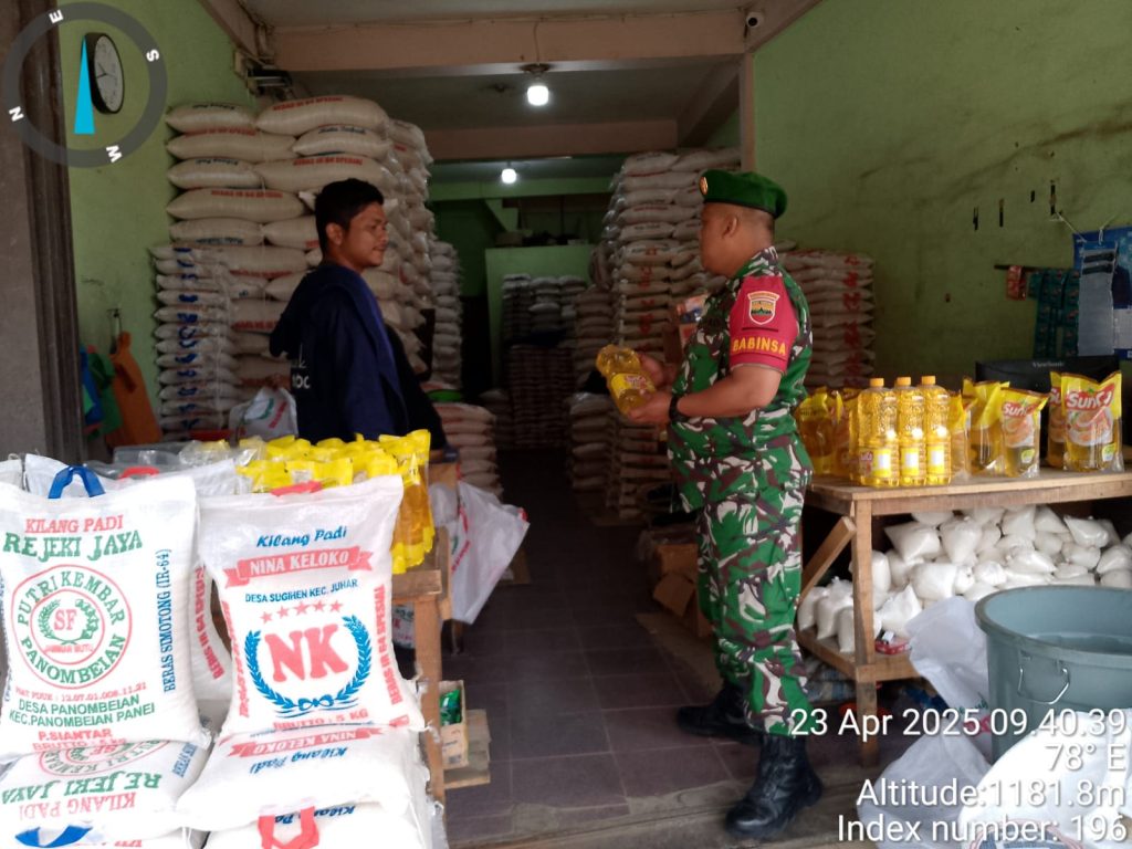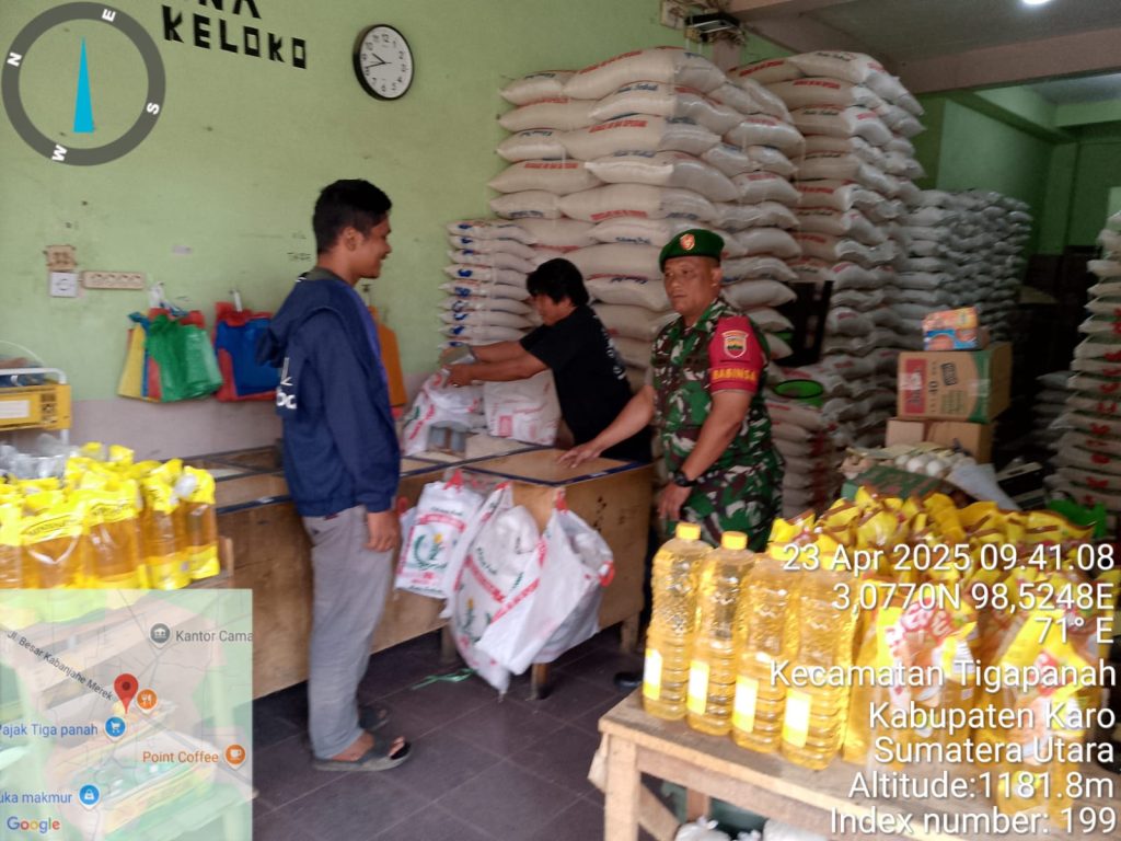 Tanah Karo. Rabu 23/04/2025. Serda Zulkarnaen Matondan sebagai Babinsa di Koramil 02/Tigapanah jajaran Kodim 0205/Tanah Karo melaksanakan monitoring stok dan harga bahan pangan terutama Sembako guna memastikan terpenuhi dan juga harga tetap terjangkau oleh Masyarakat Warga Wilayah Binaan atau sesuai jika ada keniakan Harga Eceran Tertinggi, kali kegiatanbertempat di Desa Tigapanah Kecamatan Tigapanah Kabupaten Karo-Sumatera Utara, termasuk di Toko Bahan Pangan milik Bapak Immanuel Tarigan di Pasar Tigapanah (23/04).
