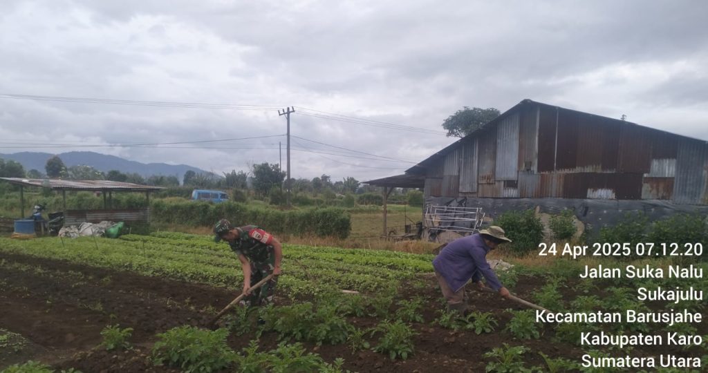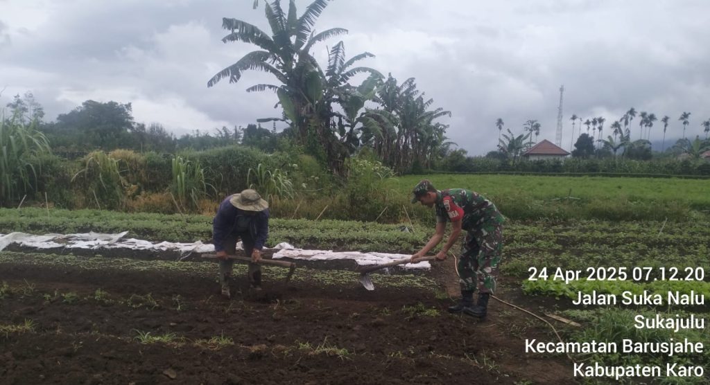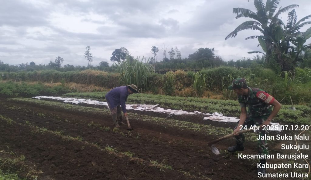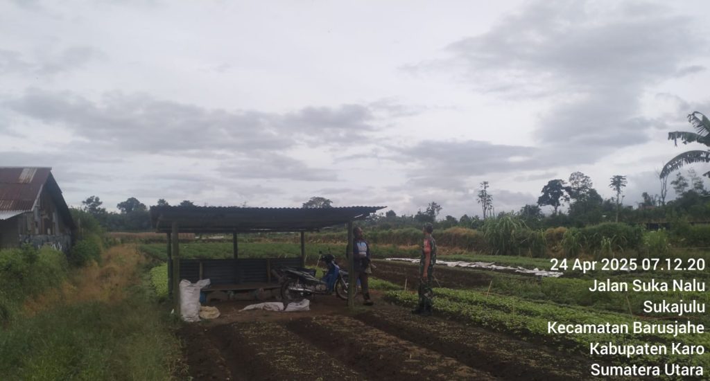 Tanah Karo. Kamis 24/04/2025. Di Koramil 01/Barusjahe jajaran Kodim 0205/Tanah Karo Serka Tudiono Situmorang bertugas sebagai Babinsa (Bintara pembina desa), selesai apel pagi dirinya melaksanakan kegiatan Komunikasi sosial (Komsos) bersilaturahmi secara humanis sambil Pendampingan Pertanian dalam rangka Ketahanan Pangan Nasional (Ketapangnas) berlokasi di lahan pertanian Desa Sukajulu Kecamatan Barusjahe Kabupaten Karo-Sumatera Utara (24/04).