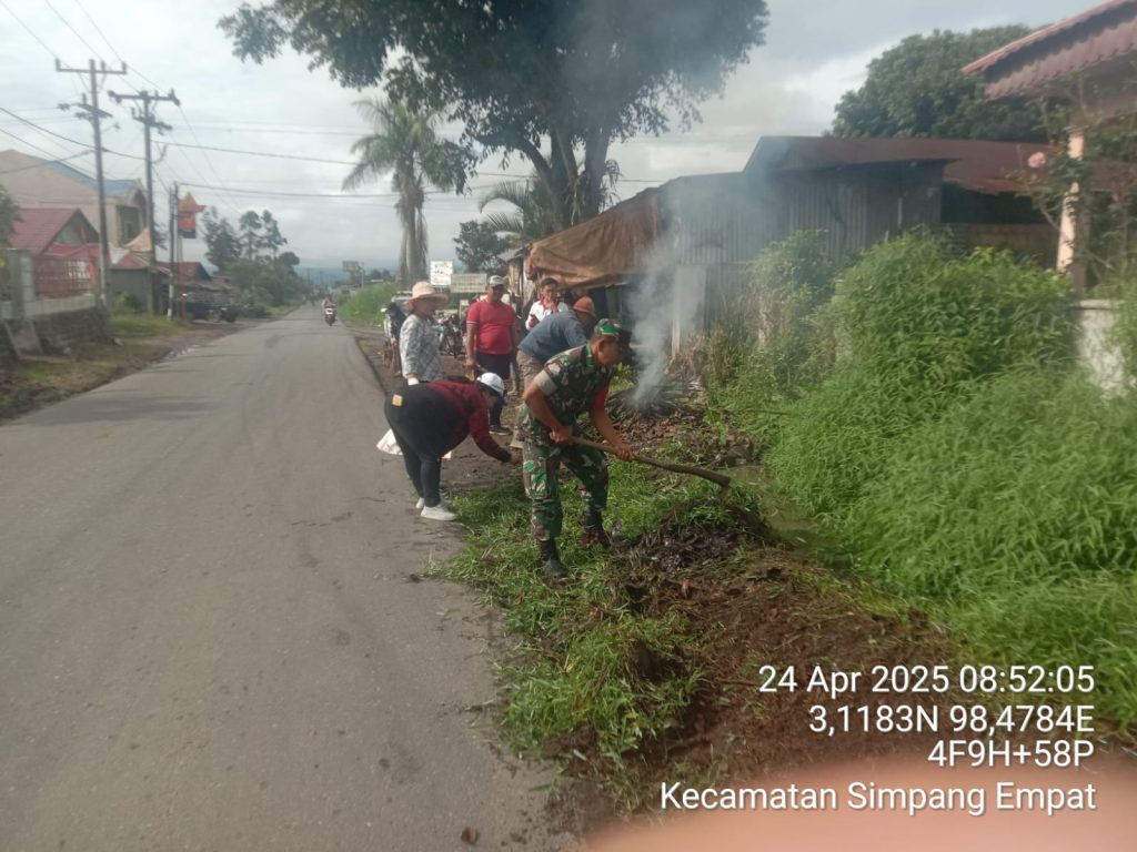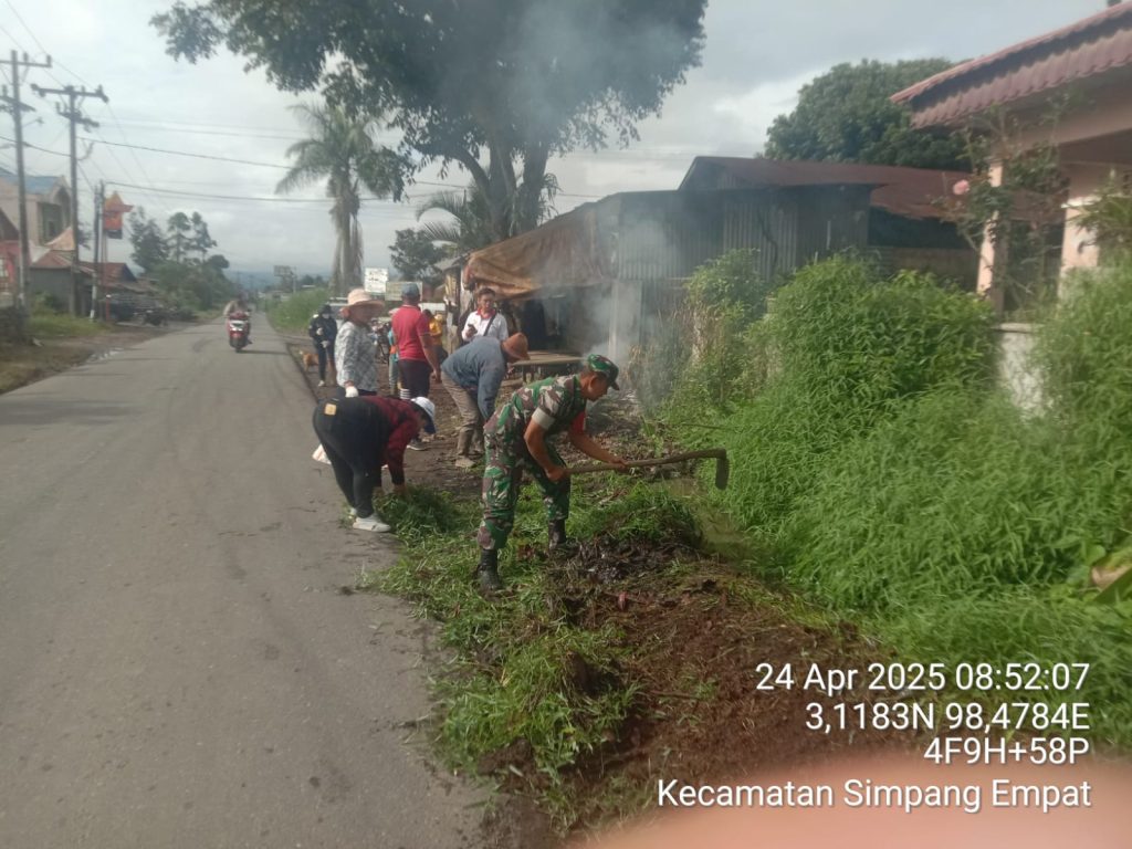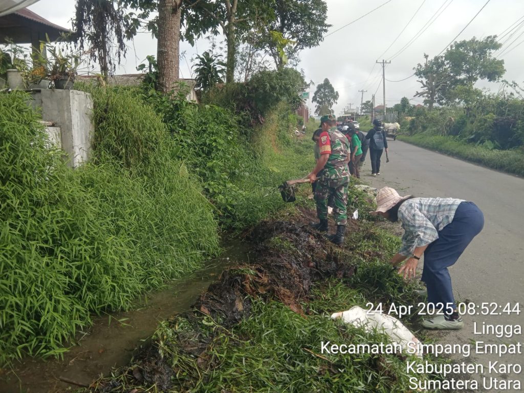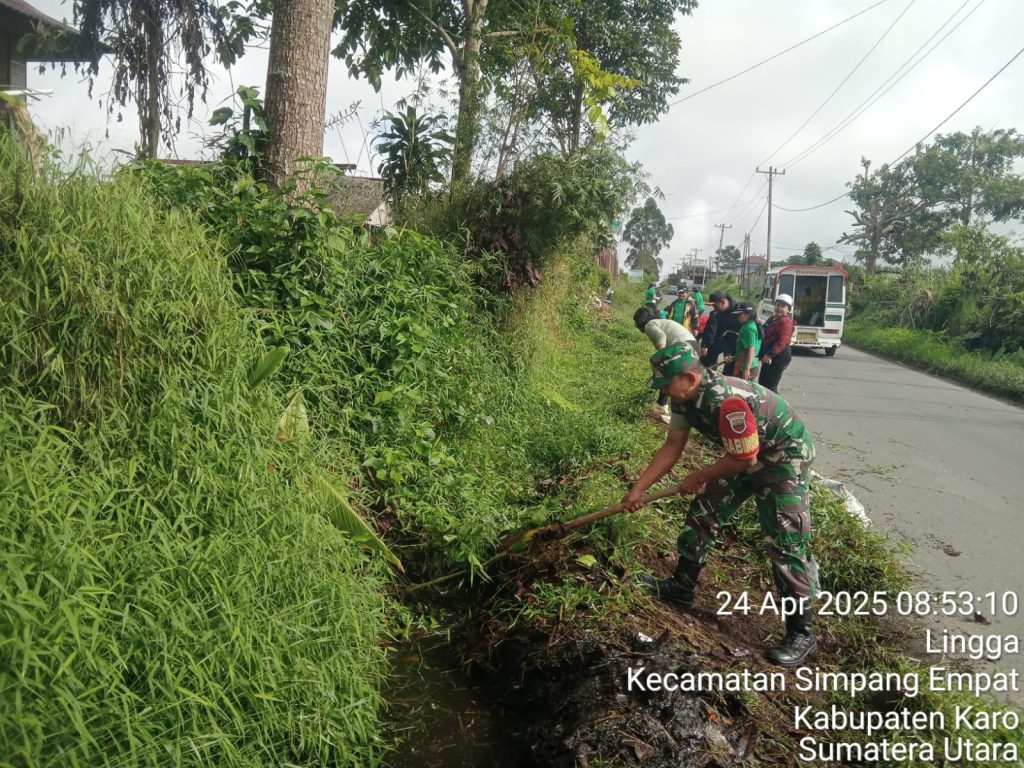 Tanah Karo. Kamis 24/04/2025. Koramil 04/Simpang Empat jajaran Kodim 0205/Tanah Karo terus memberikan rasa peduli dan perhatian terhadap masyarakat dan lingkungan di wilayah binaan, maka Kapten Czi Menson Tarigan selaku Danramil perintahkan Anggotanya terutama para Babinsanya pada hari ini (24/04) untuk ikut melaksanakan gotong royong pembersihan jalan, selokan dan lingkungan sekitar Desa, kegiatan ini juga dilaksanakan di Desa Lingga Kecamatan Simnpang Empat Kabupaten Karo-Sumatera Utara.