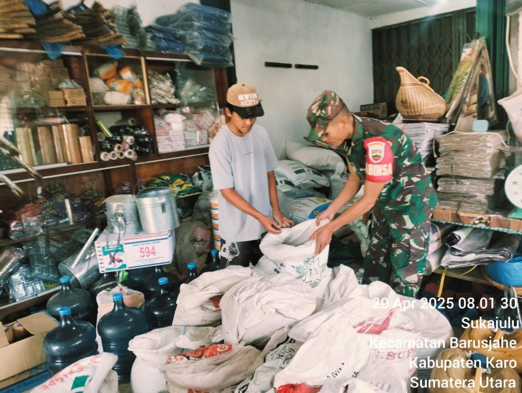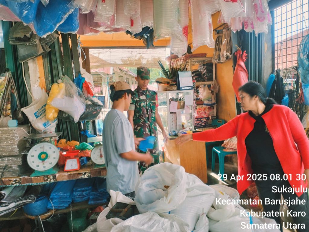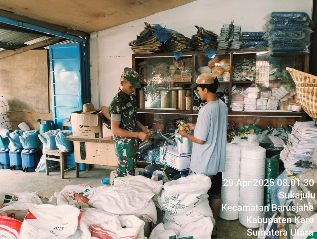 Tanah Karo. Selasa 29/04/2025. Serka Tudino Situmorang bertugas di Koramil 01/Barusjahe jajaran Kodim 0205/Tanah Karo sebagai Babinsa dalam rangka memperat jalinan tali silaturahmi dengan masyarakat warga wilayah binaan, dirinya melaksanakan Komsos (Komunikasi sosial) dengan Ibu Yofani Beru Barus pemilik Toko Pakan Hewan UD. Pandia di Pasar Pekan Tiganjumpa Jalan Tigapanah Tongkoh Desa Sukajulu Kecamatan Barusjahe Kabupaten Karo Sumatera Utara (29/01).