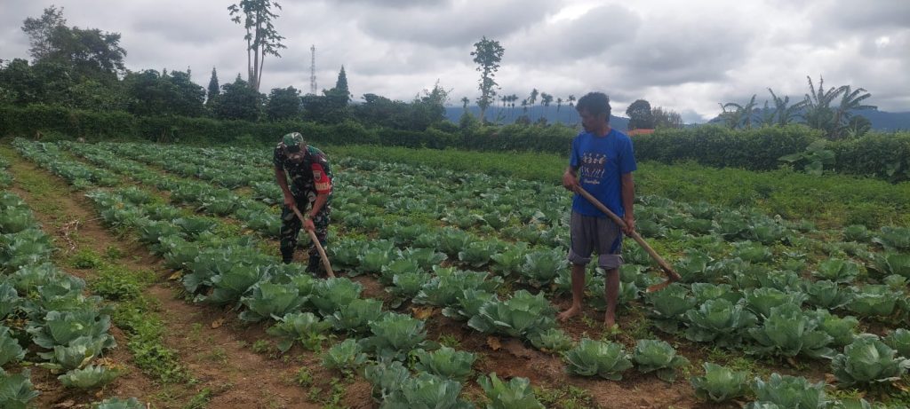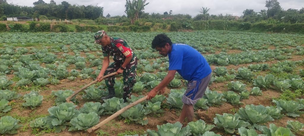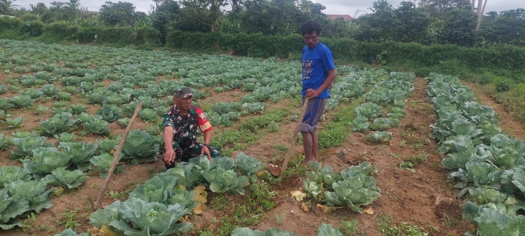 Tanah Karo. Senin 12/05/2025. Serka Reka Juli Rahmat yang bertugas sebagai Babinsa di Koramil 01/Barusjahe jajaran Kodim 0205/Tanah Karo melaksanakan  Komsos juga Pendampingan Pertanian mendampingi dan membantu Bapak Wagis Ginting yang berprofesi sebagai petani sedang merawat tanaman kol/kubis dilahan seluas 10 rante, berlokasi di hamparan lahan pertanian Desa Sukajulu Kecamatan Kecamatan Barusjahe Kabupaten Karo-Sumatera Utara.