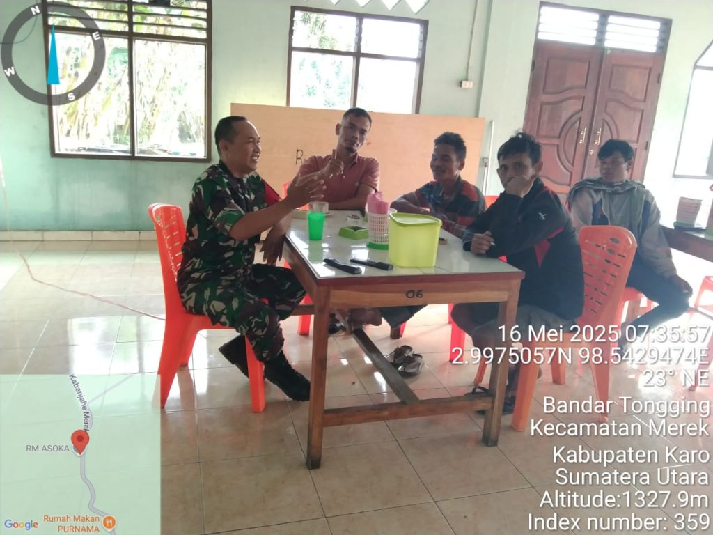Tanah Karo. Jumat 16/05/2025. Untuk menjaga hubungan baik dan jalinan tali silaturhami serta menciptakan kedekatan yang humanis dengan Masyarakat dengan Perangkat Desa, sehingga Sertu Jumaidi sebagai Babinsa di Koramil 02/Tigapanah jajaran Kodim 0205/Tanah Karo melaksanakan kegiatan Komunikasi Sosial (Komsos) di salah satu kedai kopi yaitu Kedai Kopi Bapak Agus yang berada di Jalan Merek-Kabanjahe Desa Mulial Rakyat Kecamatan Merek Kabupaten Karo-Sumtaera Utara (16/05).