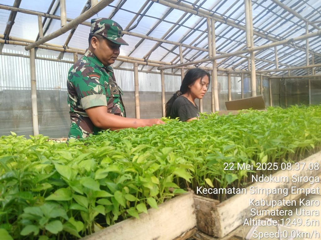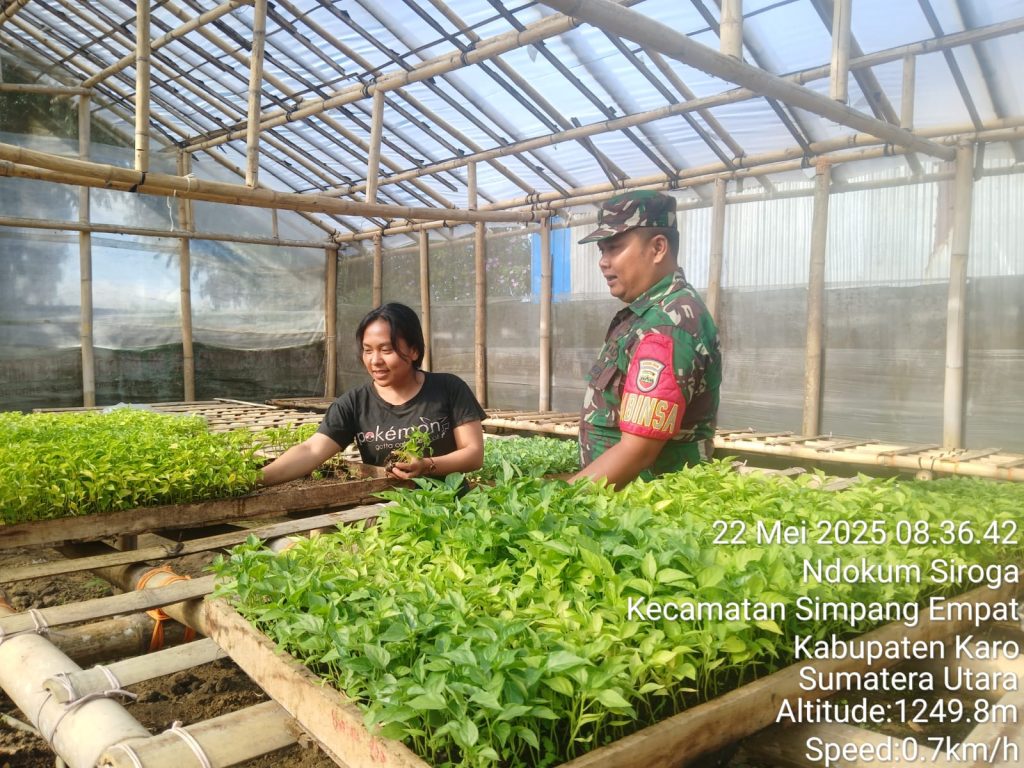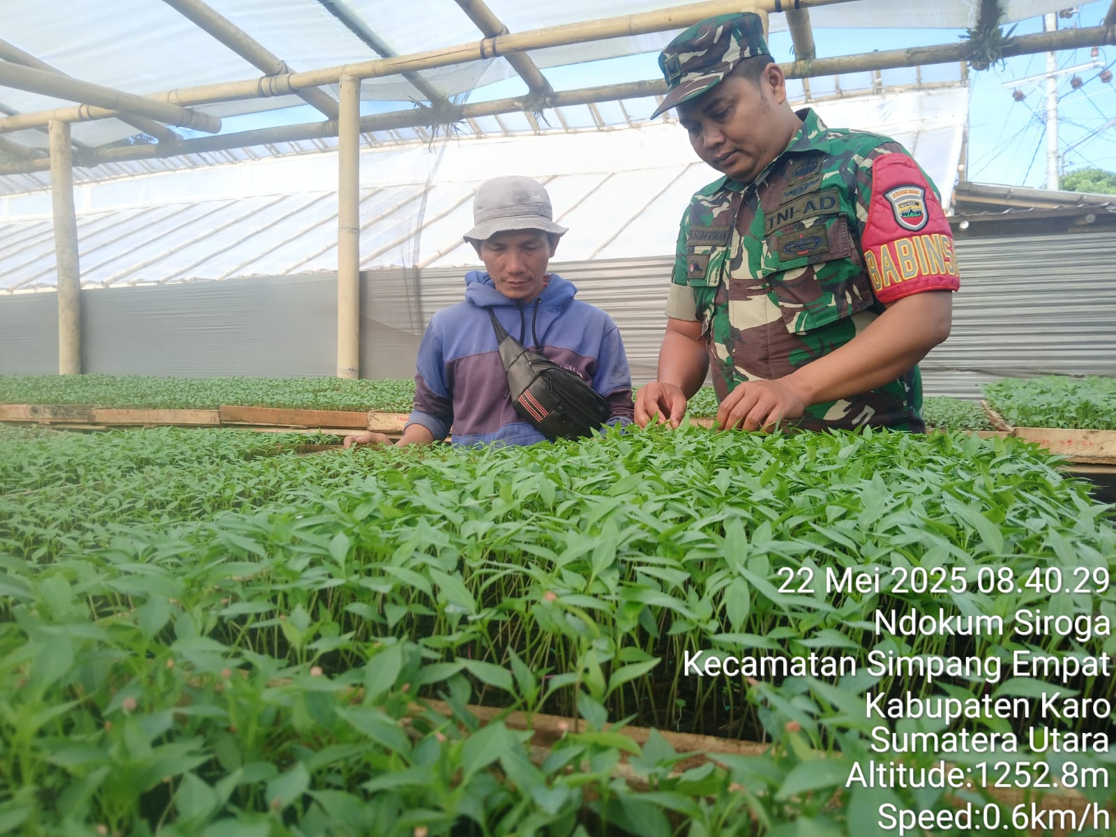 Tanah Karo. Kamis 22/05/2025. Di Pembibitan UD. K. Surbakti Jalan Berastagi-Tiganderket Desa Ndokum Siroga kecamatan Simpang Empat Kabupaten Karo Sumatera Utara, Serda Dedi Suherman Babinsa Koramil 04/Simpang Empat jajaran Kodim 0205/Tanah Karo berkunjung ke Pembibitan Tanam Muda untuk bersilaturah dengan Bapak Jhon Surbakti beserta karyawan dalam ranga Komsos (Komunikasi sosial) dan pendampangian pertanian (22/05).