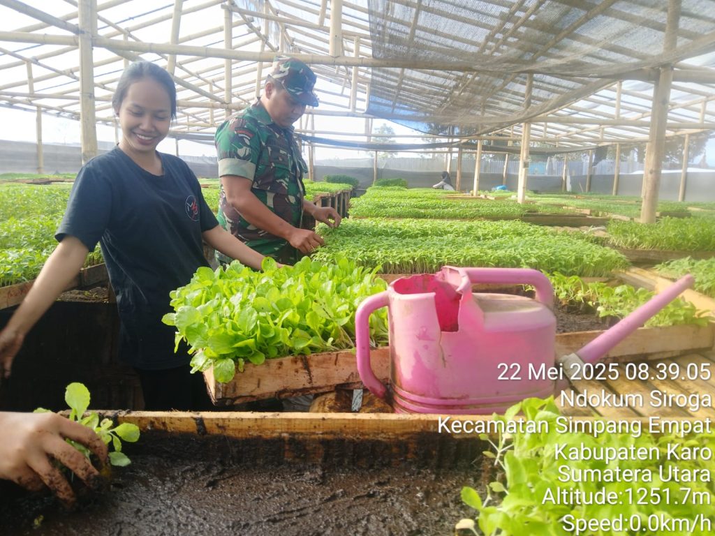 Serda Dedi Suherman Di UD. K. Surbakti Desa Ndokum Siroga juga mendampingi dan membantu karyawan merawat bibit sayur mayur, sedangkan bibit tanaman muda yang dibudidayakan adalah bibit cabai Rp. 280/batang, bibit tomat Rp. 350/batang, bibit terong Rp. 250/batang, bibit kol Rp 170/batang, bibit sawi Rp. 150/batang, bibit pepaya Rp. 3.500/batang dan bibit terong belanda Rp. 2.500/batang, tentunya kualitas bibit ini bagus, di saat kegitanpun Babinsa juga memotivasi agar lebih meningkatkan hasil produksi bibit.