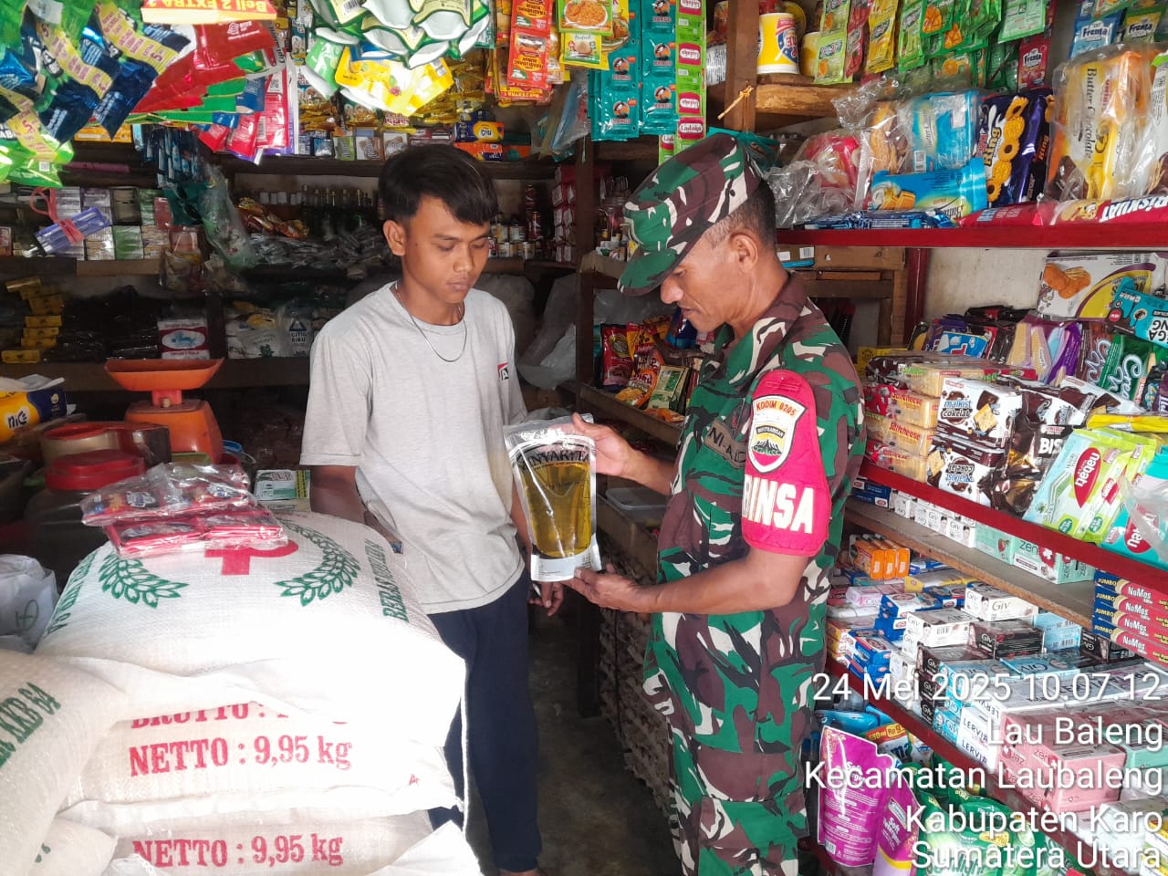 Sertu Jumarin juga sebagai Babinsa di Koramil 09/Laubaleng hari ini (24/05) juga melaksanakan Komsos di desa binaan sambil mengecek secara langsung harga dan ketersediaan bahan pangan terutama Sembako yaitu beras, minyak goreng/mentega, telur, gula pasir, garam, susu dan Bahan Bakar LPG 3 Kg juga mengecek ketersediaan mie intsan, air munum kemasan, sayur-mayur dan ikan laut maupun ikan air tawar serta ikan kering (ikan asin) di Desa Laubaleng Kecamatan Laubaleng Kabupaten Karo-Sumatera Utara teoatnya di Toko Kelontong milik Ibu Melda Beru Sembiring.