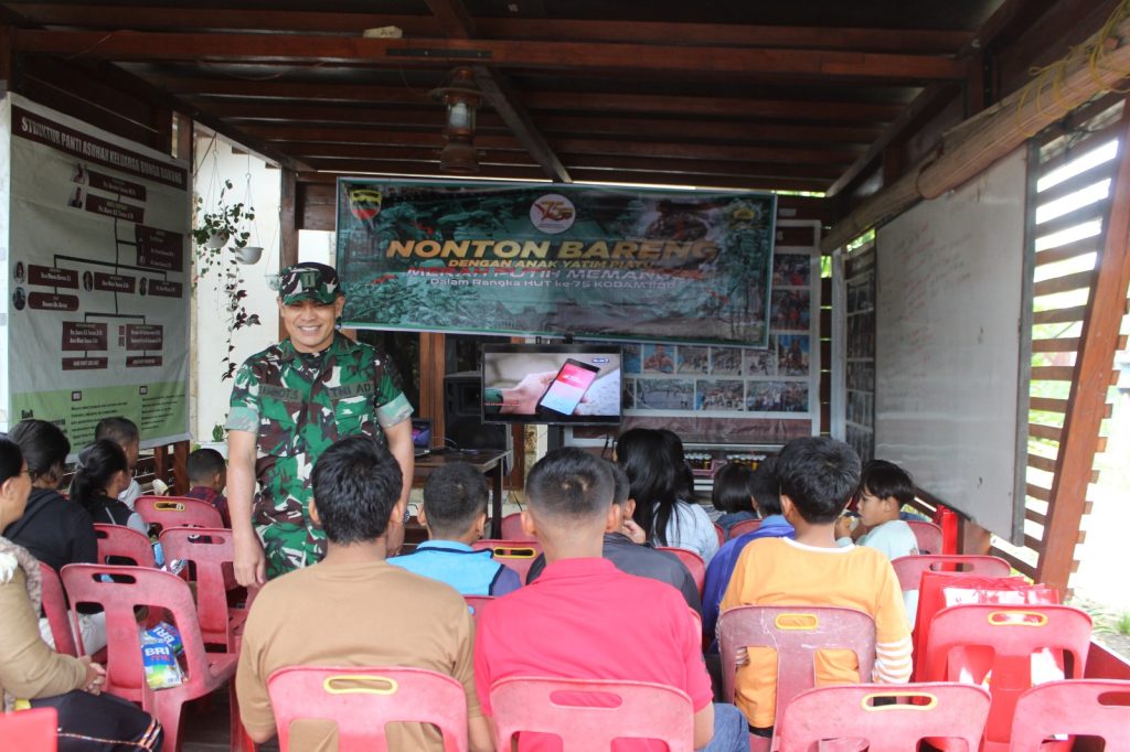 Tanah Karo. Selasa 10/06/2025. Dalam rangka HUT Ke-75 Kodam I/Bukit Barisan, Pihak Kodim 0205/Tanah Karo jajaran Korem 023/Kawal Samudera menggelar acara Nonton Bareng Bersama Anak Yatim Piatu dengan Tema “Merah Putih Temanku” bertempat di Panti Asuhan Bunga Bakung Jalan Kabanjahe-Merek Desa Bunuraya Kecamatan Tigapanah Kabupaten Karo Sumatera Utara, (10/06).