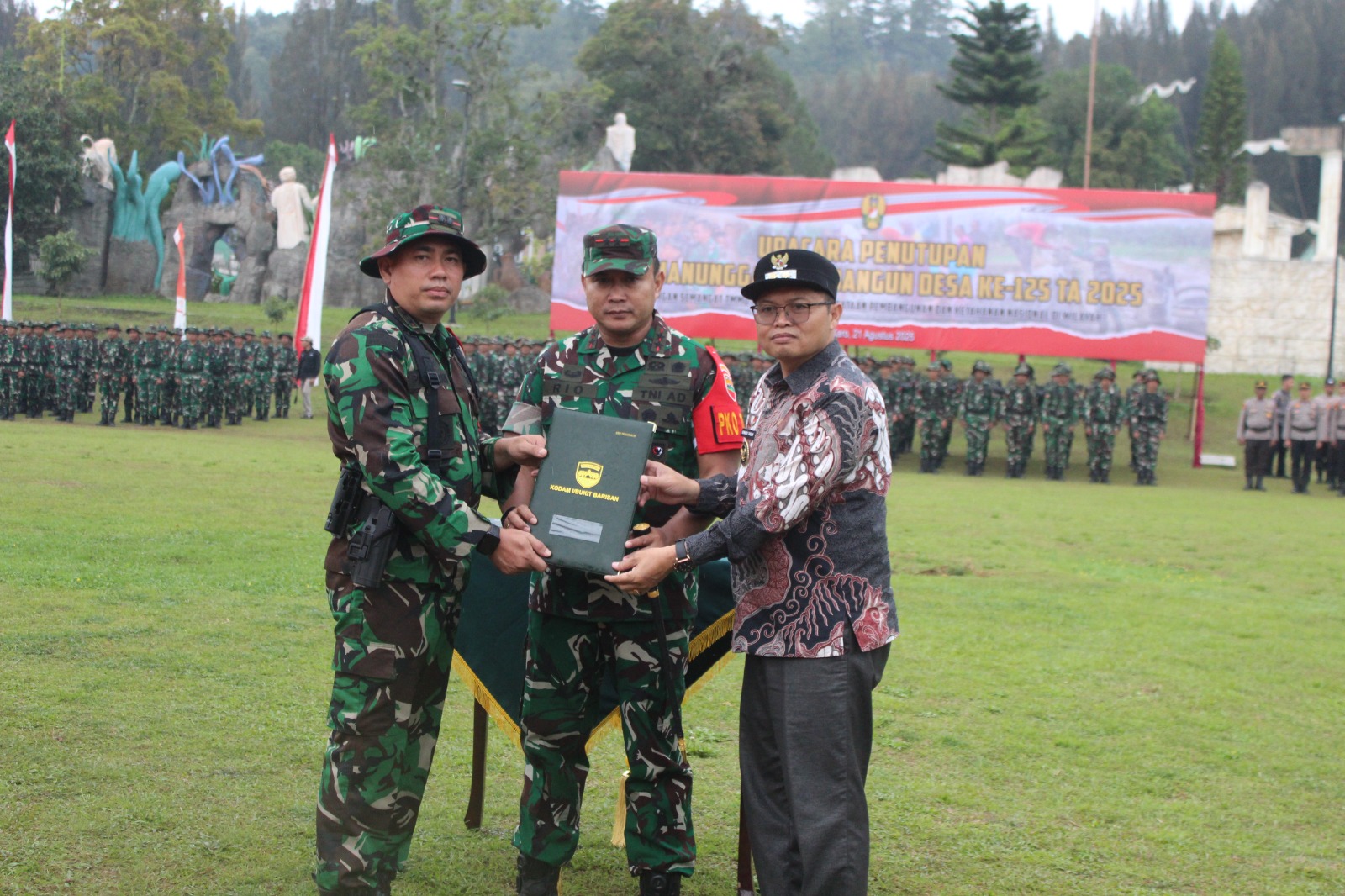 Berastagi Karo. Minggu 31 Agustus 2025. Mayjen TNI Rio Firdianto Panglima Kodam I/Bukit Barisan, secara resmi menutup kegiatan TNI Manunggal Membangun Desa (TMMD) ke-125 Tahun Anggaran 2025 yang dilaksanakan oleh Kodim 0205/Tanah Karo. Penutupan kegiatan ini berlangsung dalam upacara yang digelar di Lapangan Mikie Holidays Berastagi Jalan Jamin Ginting Desa Sempajaya, Kecamatan Bersatagi, Kabupaten Karo, Sumatera Utara. Dalam acara penutupan TMMD ini juga dilakanakan baksi social pengobatan massal, gerakan pangan murah untuk masyarakat, sejak pagi hingga siang (21/08/2025).