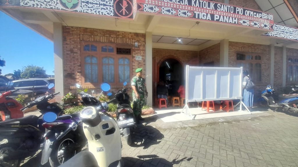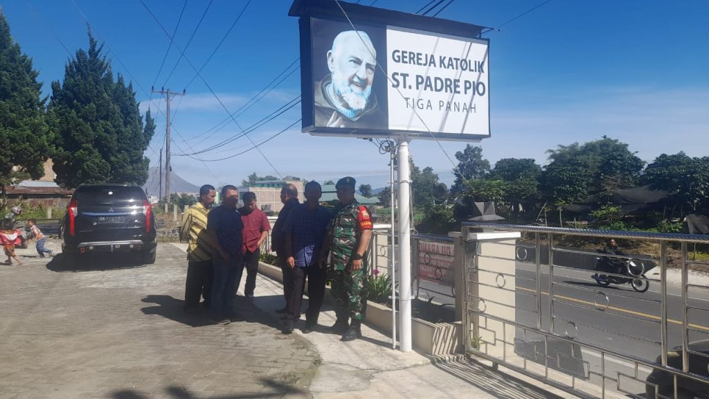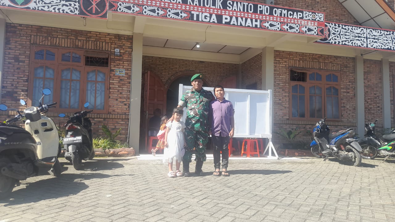 Tigapanah Karo. Minggu 5 Oktober 2025. Bagi para Babinsa Koramil 02/Tigapanah  jajaran Kodim 0205/Tanah Karo  neskipun hari libur, namun tetap melaksanakan kegiatan Komsos (Komunikasi Sosial), seperti yang dilaksanakan pada pagi hari minggu ini (5/10/2025) oleh Serda Zulkarnen Matondang melaksanakannya sambil membantu Majelis Gereja  dalam Pengamanan Ibadah Kebaktian Minggu di Gereja Katolik St. Padre Pio OFM CAP Tigapanah Jl. Merek-Kabanjahe Desa Mulawari Kecamatan Tigapanah Kabupaten Karo Sumatera Utara,  dalam kegiatan ini juga sambil mengimbau warga agar menjaga Kamtibmas, menjaga kerukunan hidup antra warga dan menjaga toleransi antar umat beragama.