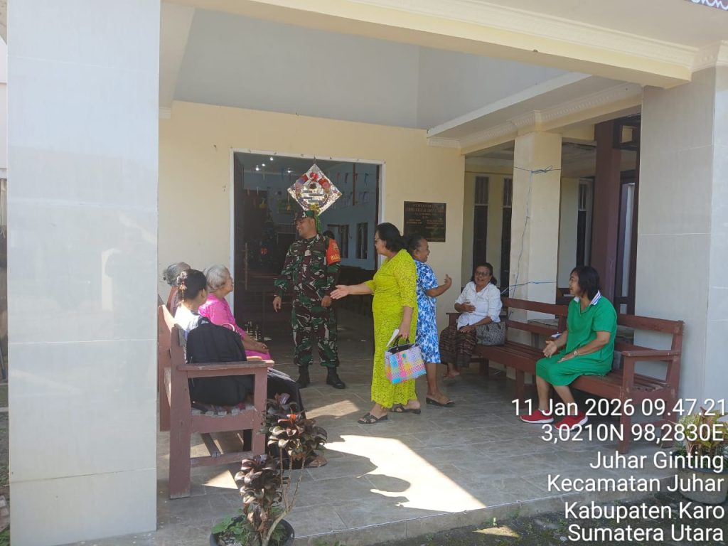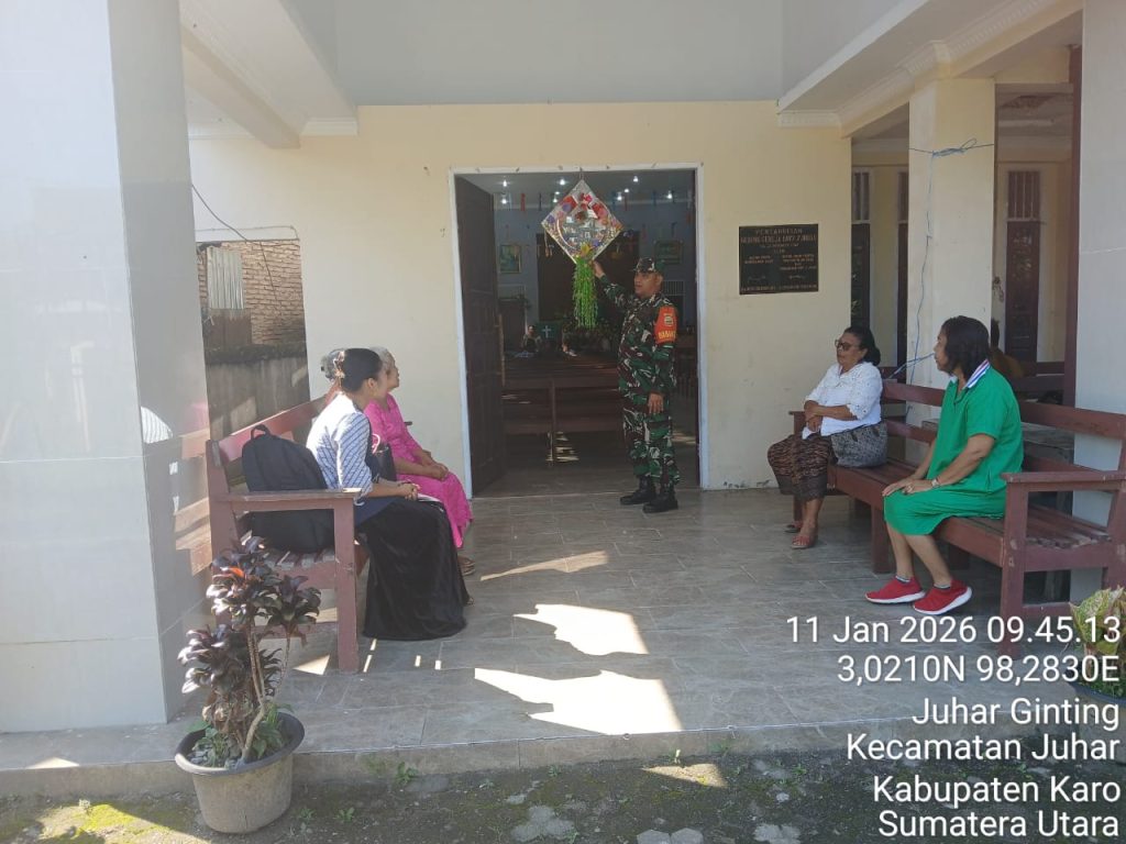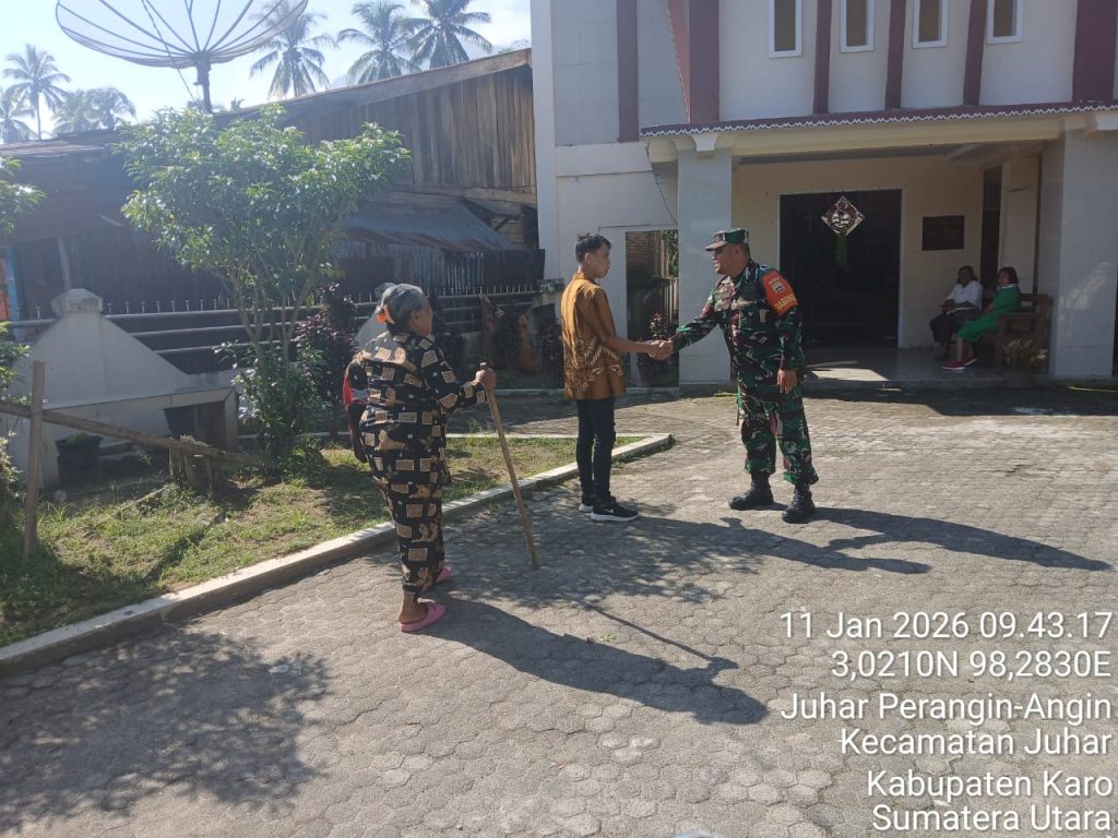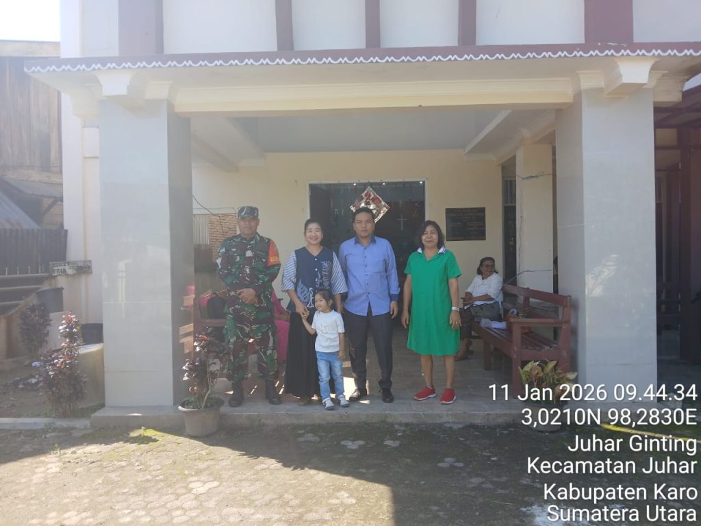 Juhar,Karo. Minggu 11 Januari 2026. Bertempat di Gereja Batak Karo Protestan (GBKP) Runggun Juhar-I Jalan pekan Tigabinanga Desa Juhar Perangin-angin, Kecamatan Juhar, Kabupaten Karo, Sumatera Utara, Serda Iwanis Sinaga yang bertugas sebagai Babinsa di Koramil 07/Juhar jajaran Kodim 0205/Tanah Karo melaksanakan Komunikasi sosial (Komsos) dengan Pendeta, Majelis Gereja, Diakoni serta Jemaat, sambil Pam (Pengamanan) kegiatan Ibadah Kebaktian Minggu, sejak pagi hari ini (11/01/2026) hingga selesai.