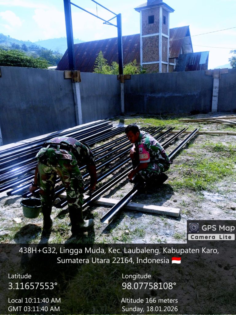 Laubaleng, Karo. Minggu 18 Januari 2026. Personel Bintara Pembina Desa (Babinsa) Koramil 09/Munte jajaran Kodim 0205/Tanah Karo, Sertu Rangkit Panjaitan menunjukkan komitmennya dalam mendukung kesejahteraan masyarakat dengan mendampingi proses pembangunan Gedung Koperasi Desa Kelurahan Merah Putih di Desa Lingga Muda, Kecamatan Laubaleng, Kabupaten Karo, Sumatera Utara.