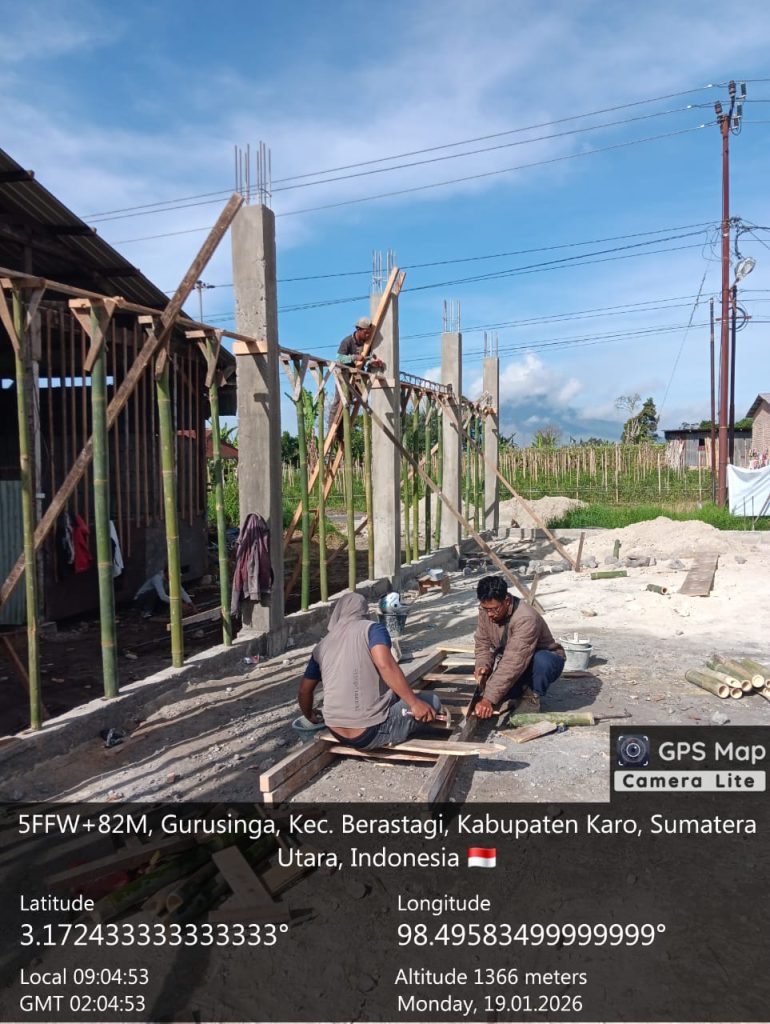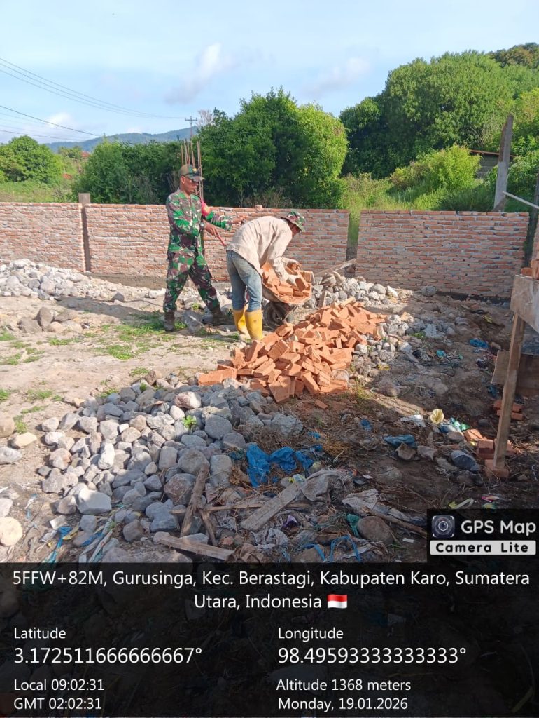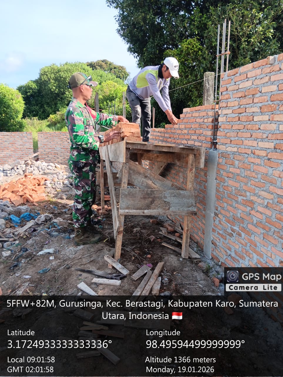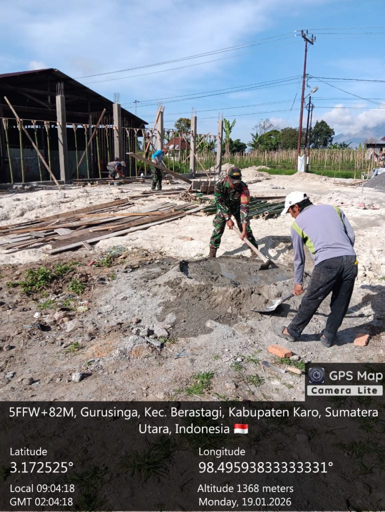 Berastagi, Karo. Senin 19 Januari 2026. Pembangunan gedung Koperasi Desa Kelurahan Merah Putih (KDKMP) di Desa Gurusinga, Kecamatan Berastagi, Kabupaten Karo terus berjalan, ini dilakukan sebagai upaya meningkatkan perekonomian dan kesejahteraan masyarakat desa. Kegiatan pembangunan tersebut mendapat pendampingan langsung oleh Serda Arif Hidayat Babinsa dari Koramil 03/Berastagi jajaran Kodim 0205/Tanah Karo sebagai bentuk dukungan TNI terhadap program pemberdayaan masyarakat desa.