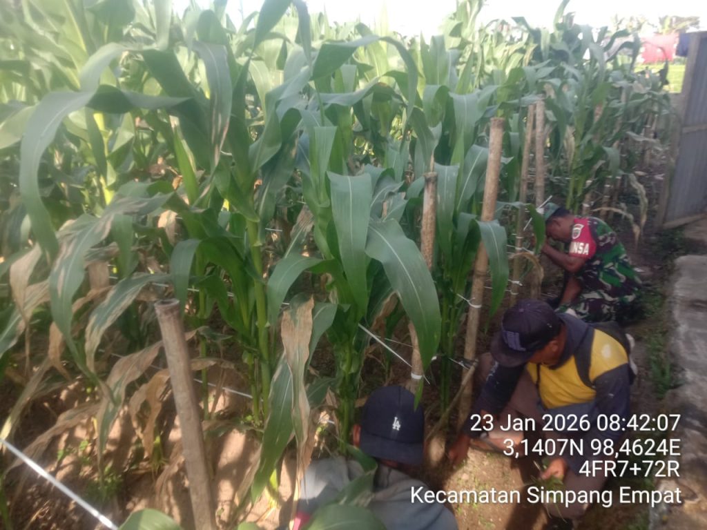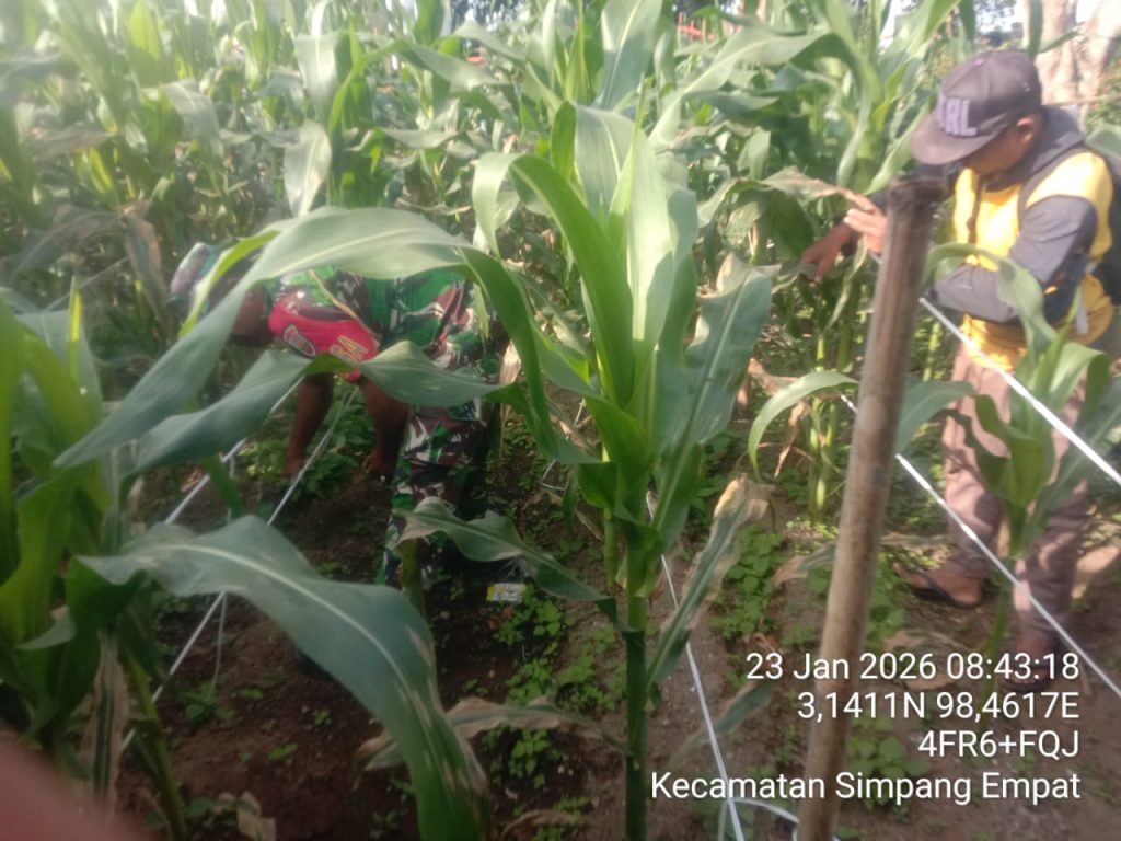 Simpang Empat Karo. Jumat 23 Januari 2026. Guna mendukung susksenya Program Ketahanan Pangan Nasional menuju swasembada pangan dan kemandirian pangan, terus dilakukan oleh pihat TNI, seperti yang dilakukan oleh Serka Sudino Sihombing Babinsa (Bintara Pembina Desa) dari Koramil 04/Simpang Empat jajaran Kodim 0205/Tanah Karo aktif Pendampingan Pertanian yaitu mendampingi para petani dalam merawat tanaman palawija jenis jagung di wilayah binaannya.