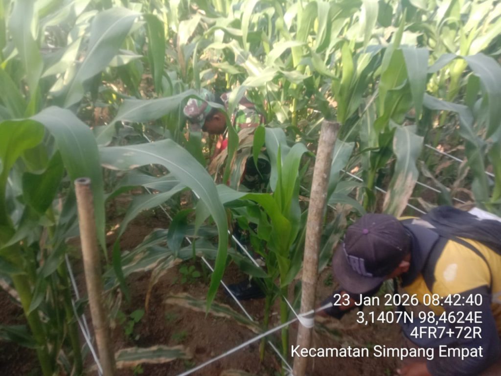 Lokasi Pendampingan Pertanian pada hari ini (23/01/2026) di Desa Ndokum Siroga, Kecamatan Simpang Empat, Kabupaten Karo, Sumatera Utara. Kegiatan yang dilakukan oleh Serka Sudino Sihombing yaitu membantu pengecekan pertumbuhan tanaman, pembersihan gulma dan pemberian pupuk terhadap tanaman jagung varietas Pioneer P-32 Singa di hamparan lahan pertanian seluas 2.000 M² , Johanes Surbakti warga desa ndokum siroga.