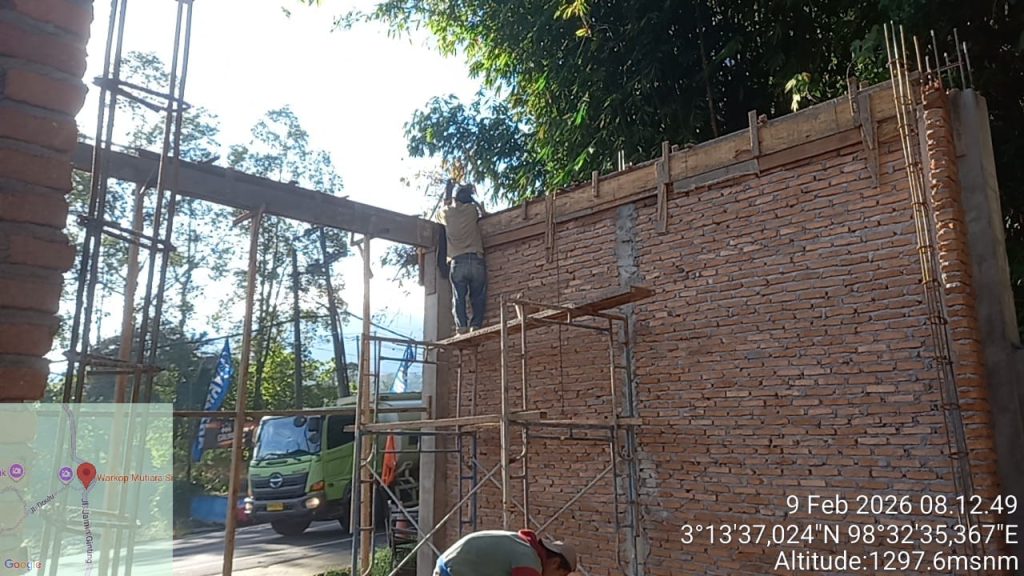 Pada hari ini (09/02/2026) pembangunan Kantor KDKMP Desa Doulu pada tahap pemasangan batu bata,cor ring balok, melaster dinding bagian luar, luas bangun gedung koperasi ini 30 Meter x 20 Meter (600 Meter²), didirikan diatas lahan seluas 32 Meter x 25 Meter (800 Meter²), aset tanah milik Dinas Kehutanan Provinsi Sumetra Utara (Tahura Bukit Bartisan), progres baru mencapai 22,75 persen. (Bayu W. Gatubima_Pendim 0205/TK)