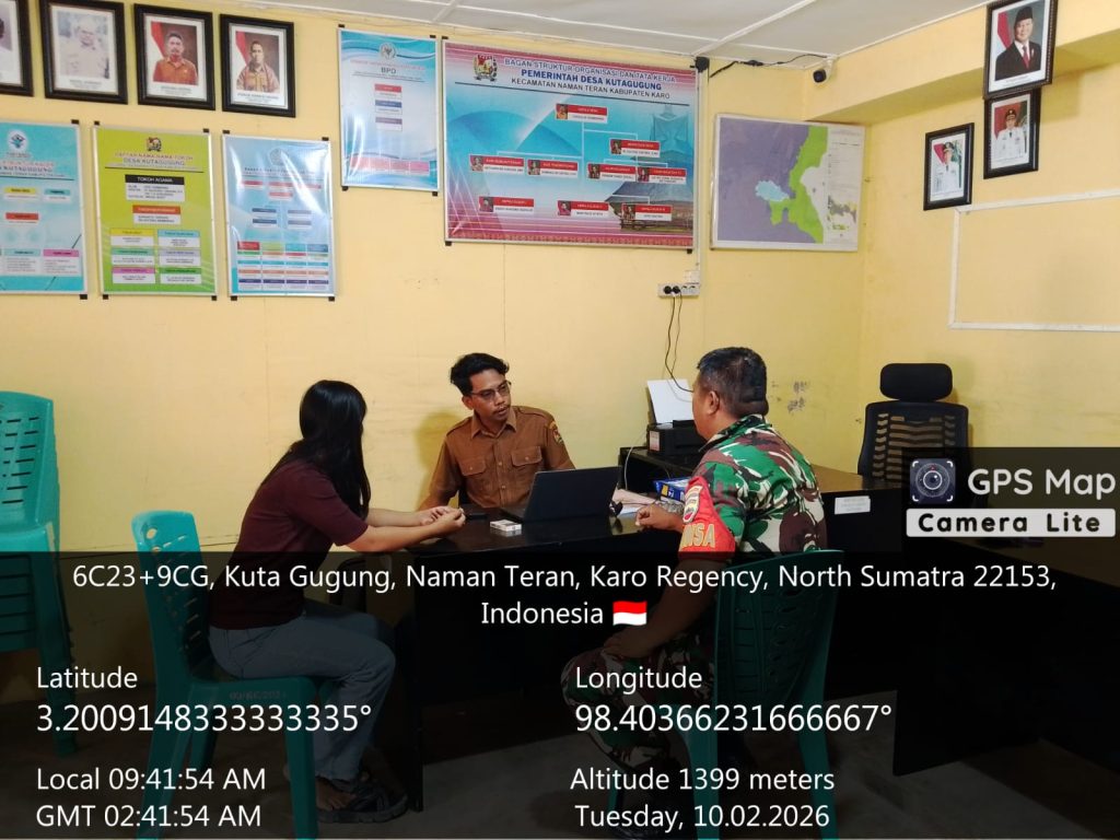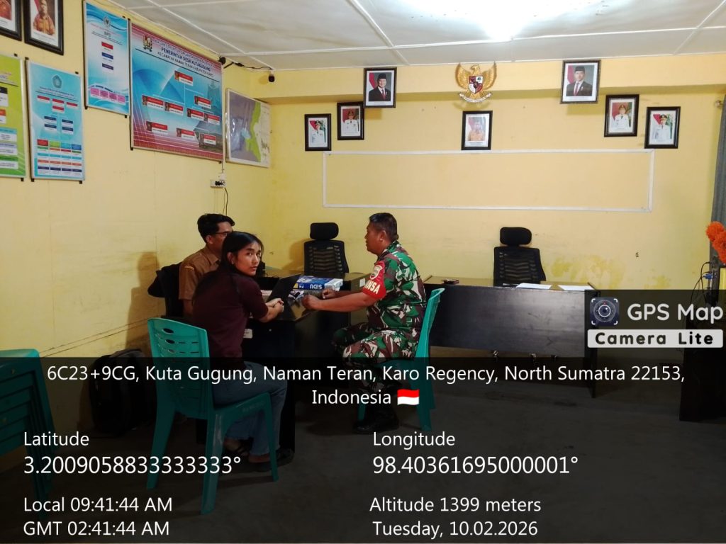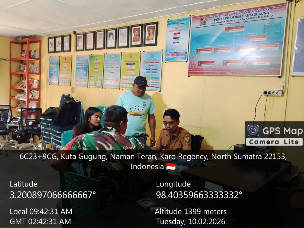 Naman Teran, Karo. Selasa 10 Februari 2026. Guna menjaga stabilitas dan memelihara hubungan baik antara TNI dengan pemerintah desa, Babinsa Koramil 04/Simpang Empat jajaran Kodim 0205/Tanah Karo untuk Desa Kuta Gugung, Serda Dedi Afrizal, melaksanakan kegiatan Komsos (Komunikasi Sosial) Humanis bersama Perangkat Desa di Kantor Desa Jalan Danau Laukawar Desa Kutagugung, Kecamatan naman Teran, Kabupaten Karo, Sumatera Utara.