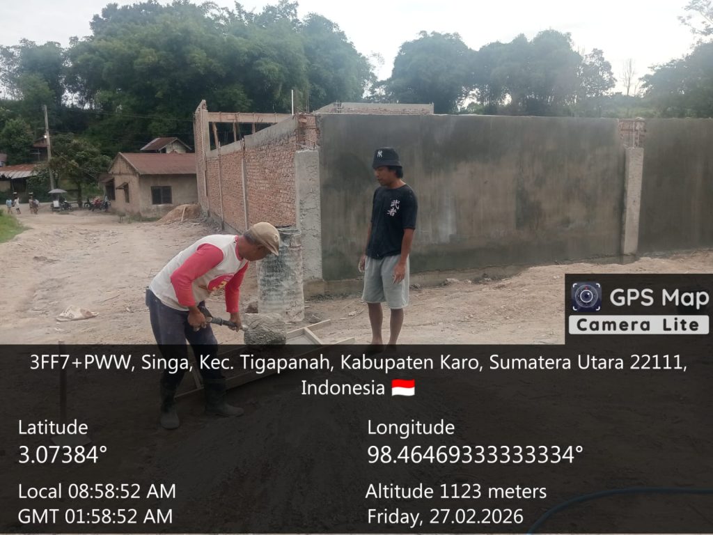 Sejak pagi hari ini (27/02/2026) hingga petang pekerjaan pembangun terus berlangsung, sekarang pada tahap plester dan acian dinding. progres 25,94 persen, ukuran bangunan 30 Meter x 20 Meter (600 Meter²), didirikan diata lahan seluas 35 Meter x 30 Meter (10.50 Meter²), aset tanah milik Pemerintah Desa Singa.