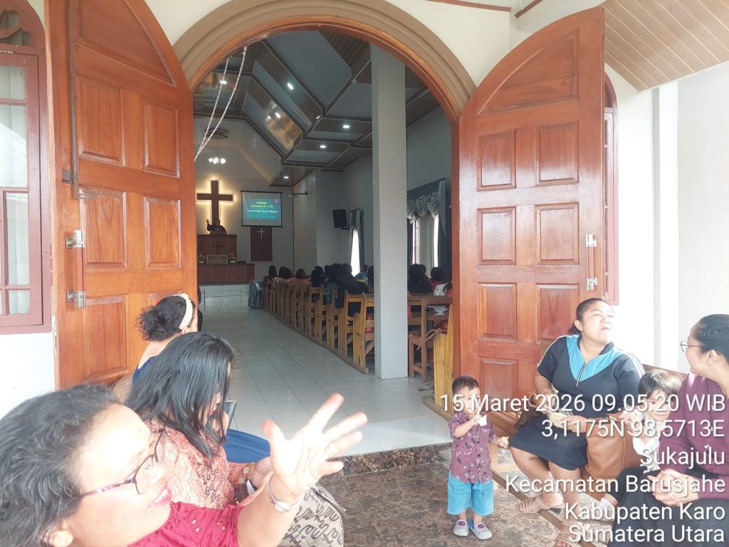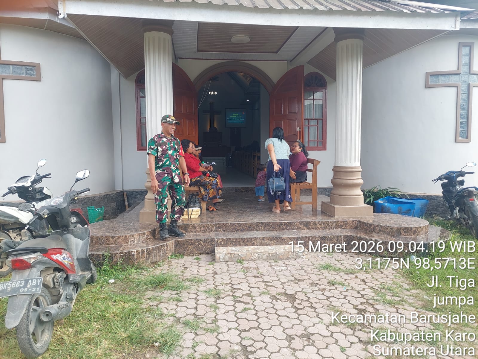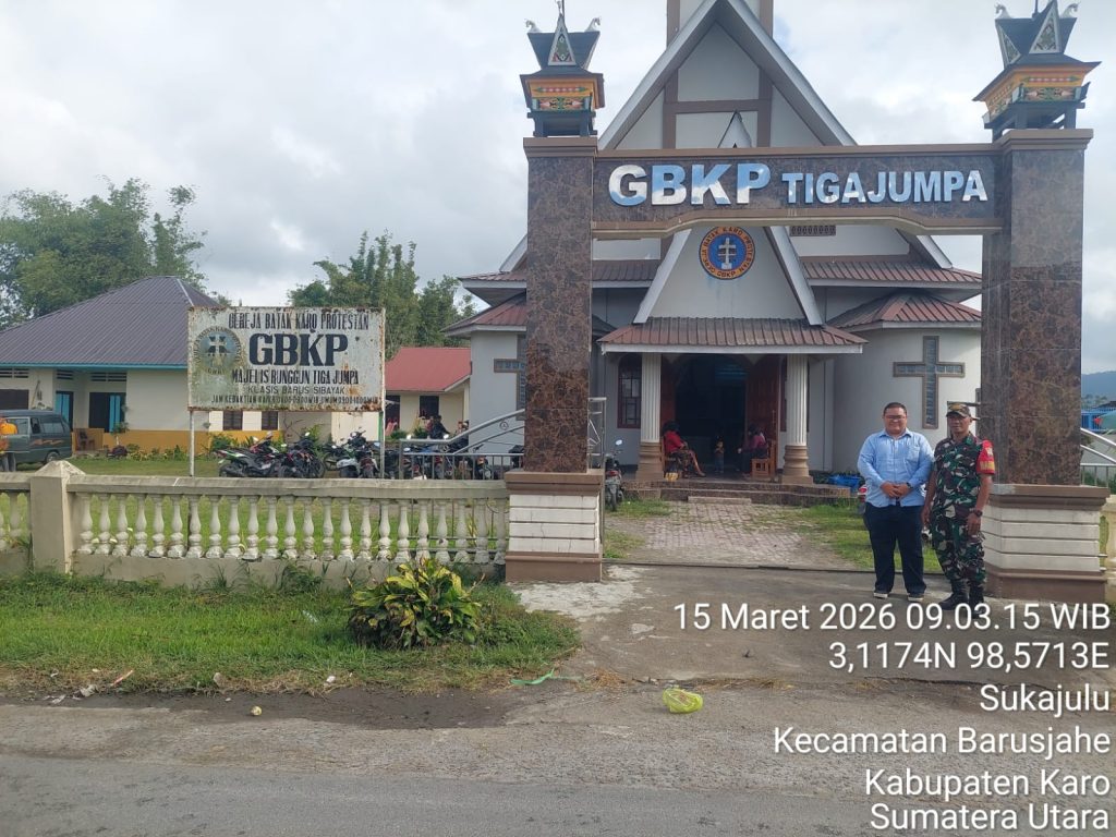 Babinsa Serka reka Juli Rahmat melaksanakan kegiatan di Gereja Batak Karo Protestan (GBKP) Tigajumpa Jalan Gotong Royong Desa Sukajulu, Kecamatan Barusjahe, Kabupaten Karo, Sumatera Utara, sejak pagi hari (15/03/2026) hingga singa, saat dilokasi, Babinsa sambil melaksanakan Komsos dengan Majelis Gereja dirinya bersama Diakoni melaksanakan Pengamanan Ibadah Kebaktian Minggu bahkan menyampaikan imbauan kepada jemaat.