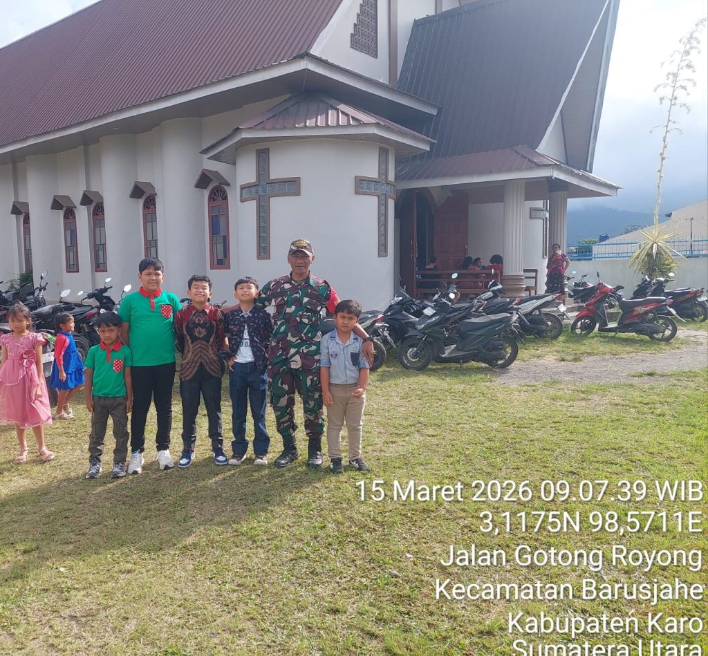 Barusjahe, Karo. Minggu 15 Maret 2026. Serka Reka Juli Rahmat bertugas sebagai Babinsa (Bintara Pembina Desa) di Koramil 01/Barusjahe jajaran Kodim 0205/Tanah Karo, hadir di desa binaan untuk dukung kelancaran jalannya Ibadah kebaktian minggu di gereja, sebagai salah satu bentuk wujud nyata TNI selalu hadir di tengah-tengah rakyat.