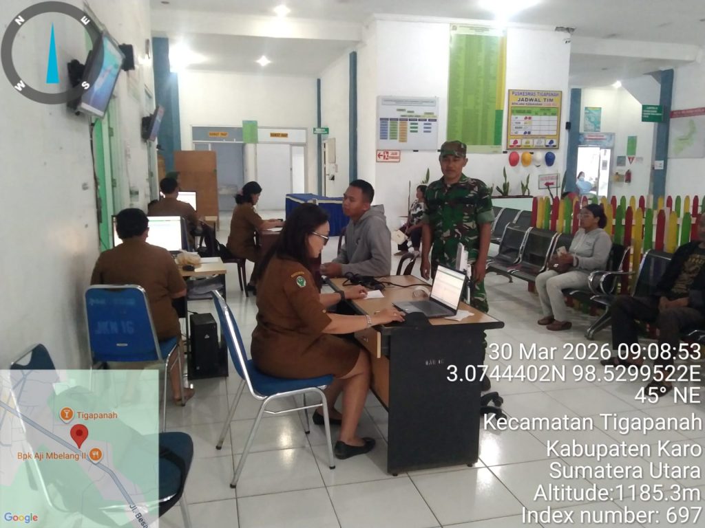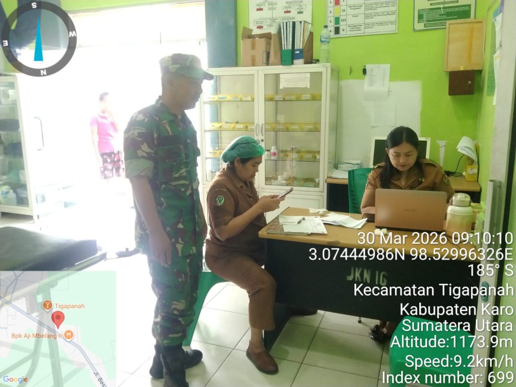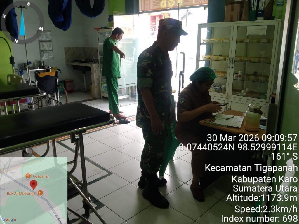 Tigapanah, Karo. Senin 30 Maret 2026. Guna meningkatkan kepedulian terhadap kesehatan warga wilayah binaan dan menjaga Kemanunggalan TNI dengan Rakyat, Babinsa (Bintara Pembina Desa) dari Koramil 02/Tigapanah jajaran Kodim 0205/Tanah Karo, Sertu Jumaidi, melaksanakan kegiatan pendampingan terhadap warga binaan yang sudah Lasia sedang menjalani pengobatan di Puskesmas Tigapanah, Jalan Kabanjahe-Merek Desa Tigapanah, Kecamatan Tigapanah, Kabupaten karo, Sumatera Utara, (29/03).