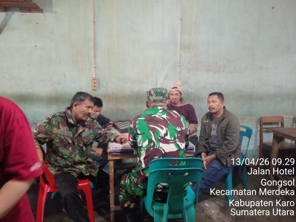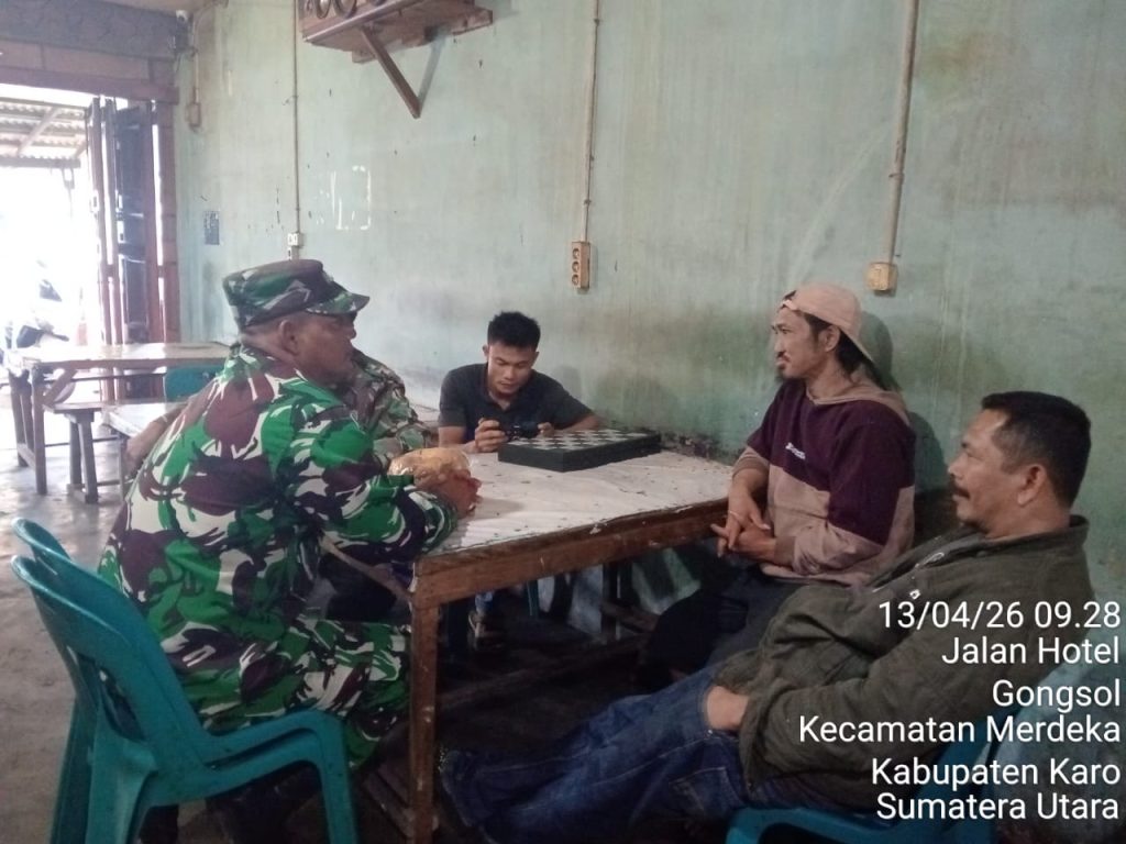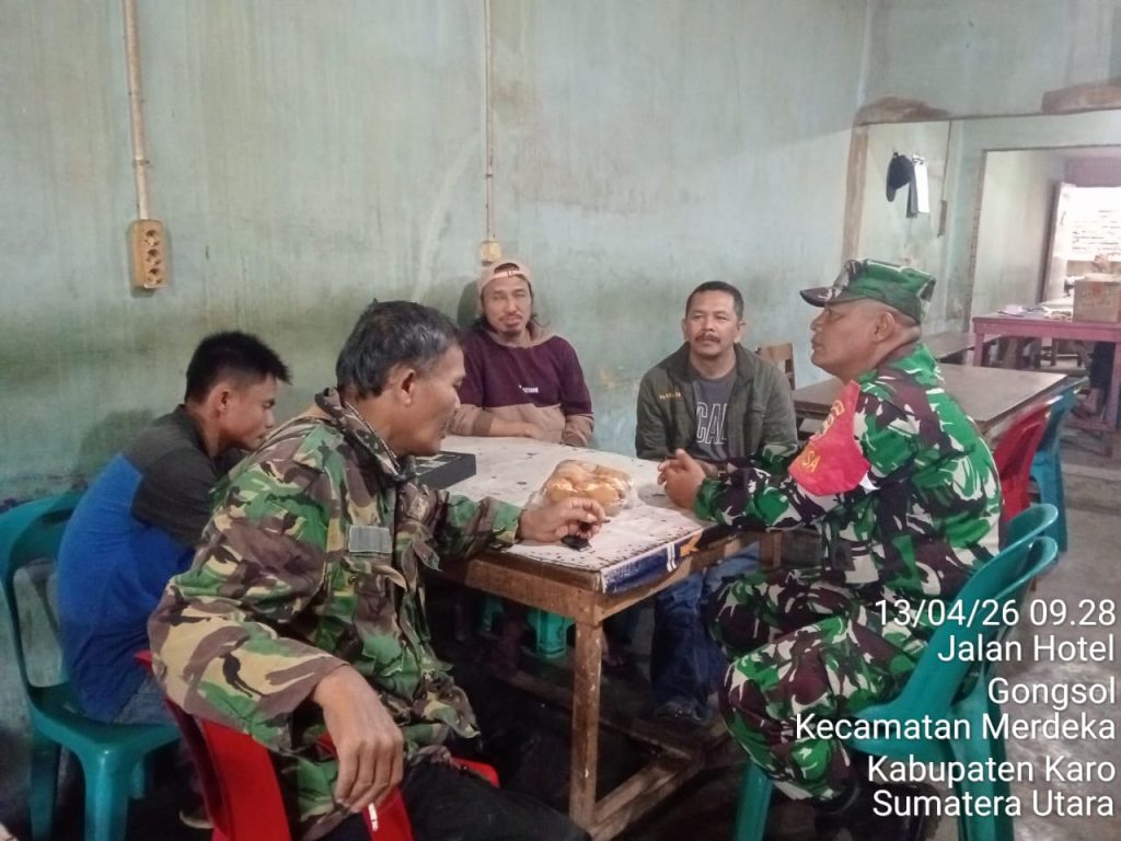 Merdeka, Karo. Senin 13 April 2026. Serda Agus Supriyadi dan Serda Dedi Suherman personel Bintara Pembina Desa (Babinsa) dari Koramil 04/Simpang Empat Kodim 0205/Tanah Karo, untuk memperat silaturahmi dan hubungan baik, menggelar Komunikasi sosial (Komsos) di Kedai Kopi milik Bapak Iwan Pandia, Jalan Gundaling Desa Gongsol Kecamatan Merdeka Kabupaten Karo, Sumuatera Utara (13/04/2026).