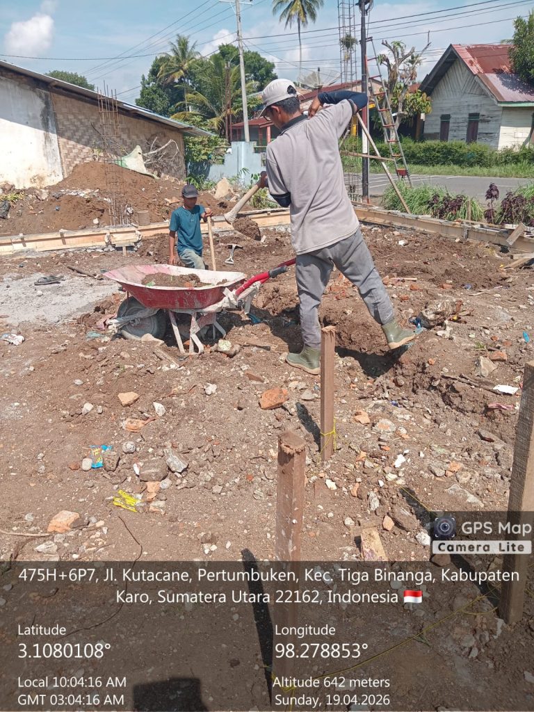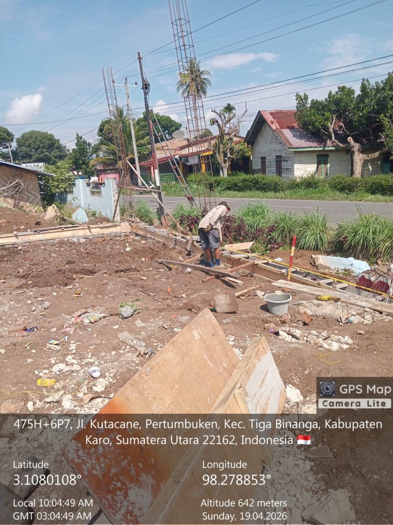 pembangunan Kantor KDKMP Desa Perbesi di tahap pekerjaan galian tanah pondasi footplat, pekerjaan pondasi batu belah, pembuatan mall tiang sumbu, perakitan besi tapak gajah, pengerjaan perundukan tanah, pengecoran tiang sumbu, pengerjaan kolom fedestal tipe K1b ukuran 25x30cm dan pengerjaan kolom fedestal tipa K1a ukuran 25×30 cm, pengerjaan sloof 15×25 serta pengerjaan urugan tanah peninggian termasuk pemadatan tanah.