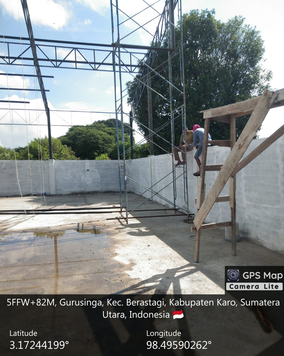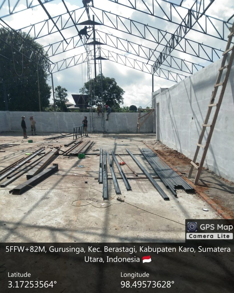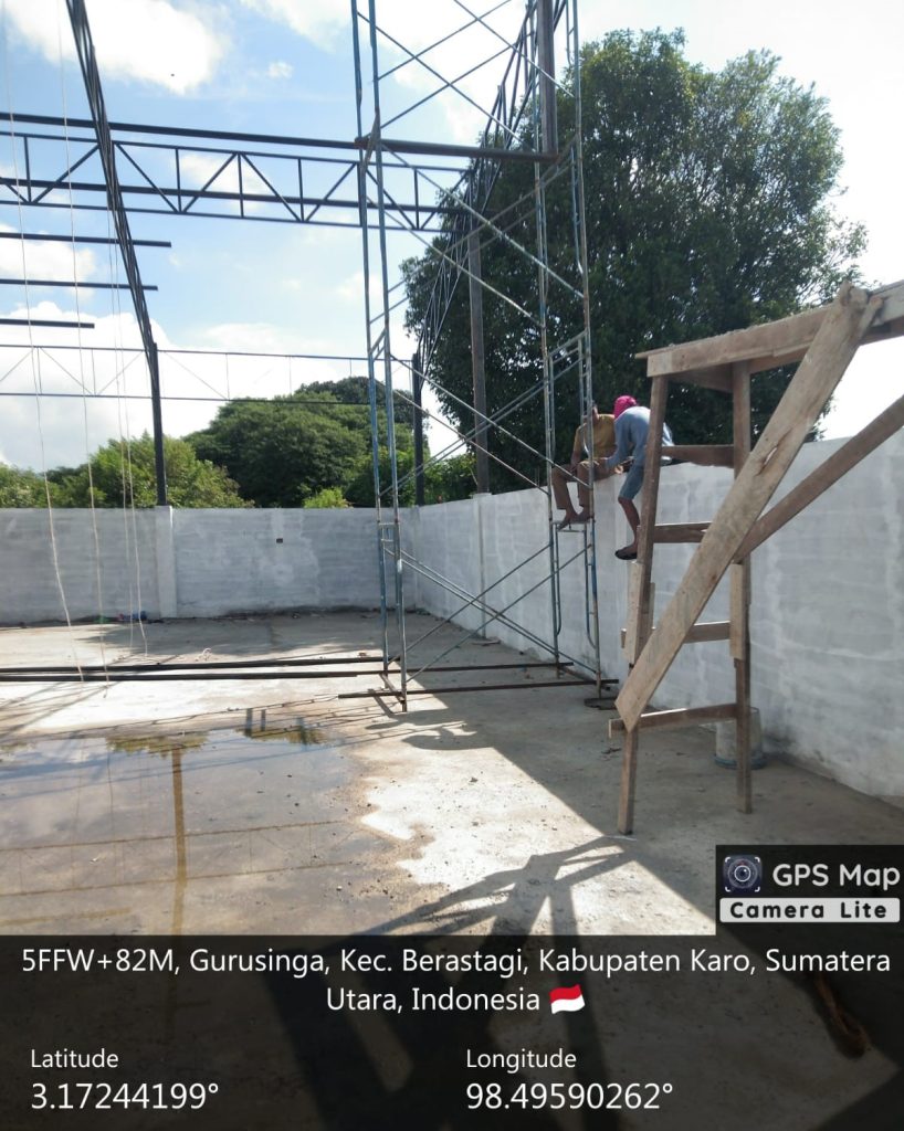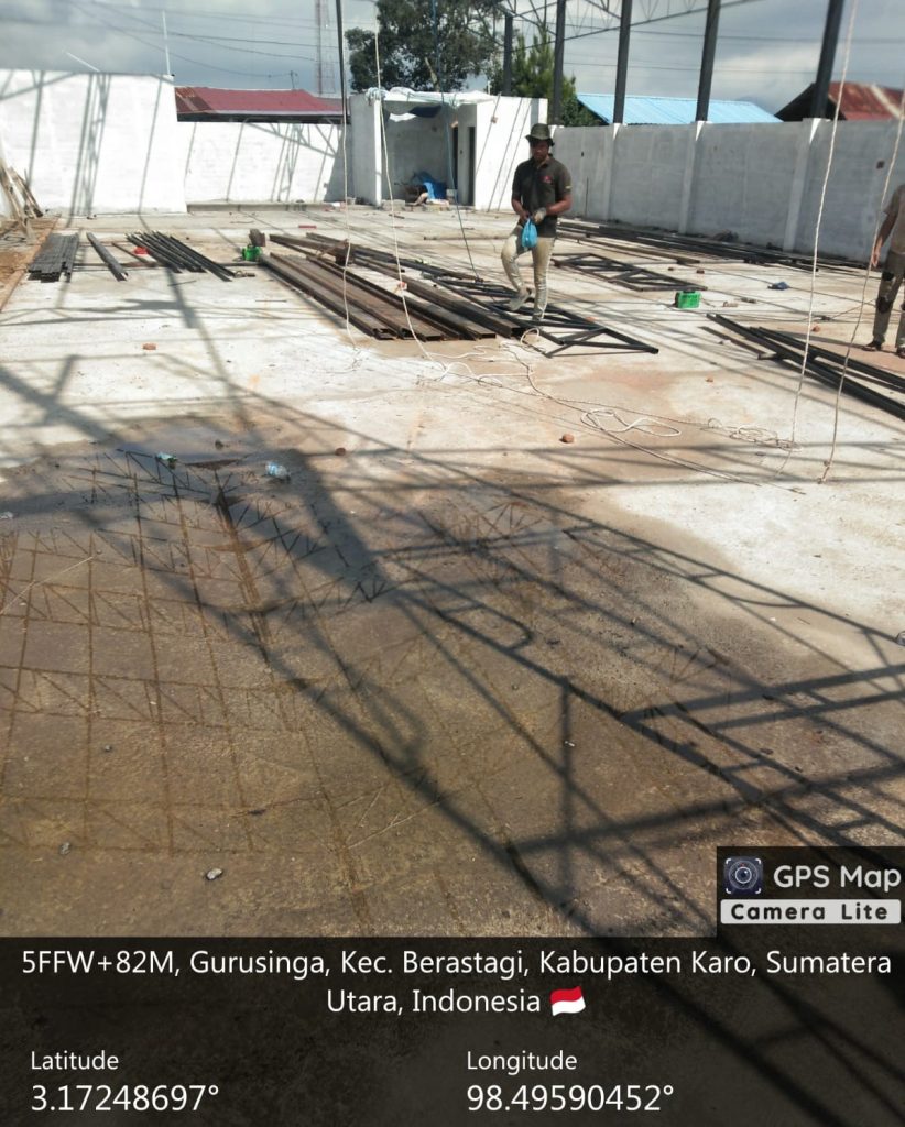 Pada hari ini (20/04/2026) pekerjaan ditahap melanjudkan pemasangan kuda-kuda BRC atas, pengecatan silen cat dasar, penimbunan dan pemadatan tanah, progres mencapai 59,13 persen. ukuran gedung 30 Meter X  20 Meter (600 Meter persegi), luas lahan 30 Meter X 20 Meter (600 Meter), asset tanah mililk Pemeritah Kabupaten Karo (bekas gudang pendingi).