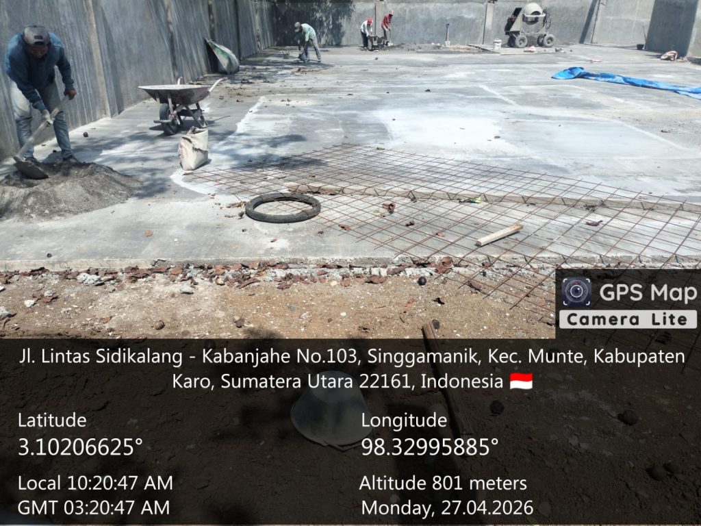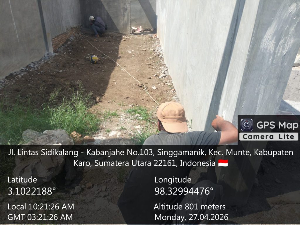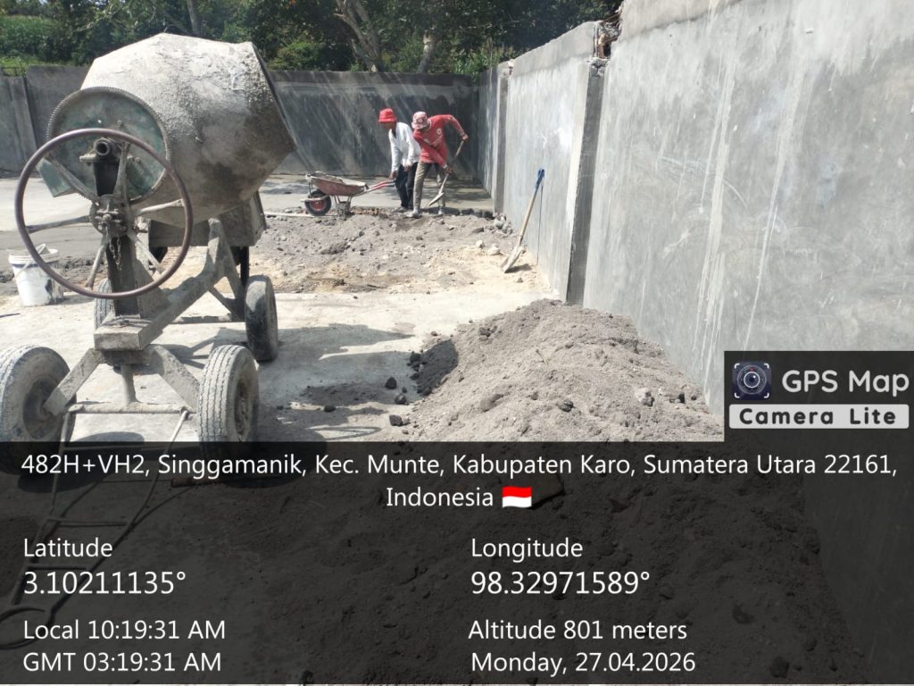 Munte, Karo. Senin 27 April 2026. Bintara Pembina Desa (Babinsa) Koramil 06/Munte jajaran Kodim 0205/Tanah Karo, Sertu Mujakarya Sebayang, terus mengawal proses pembangunan fisik Gedung Koperasi Desa Kelurahan Merah Putih (KDKMP) yang berlokasi di Desa Singgamanik, Kecamatan Munte, Kabupaten Karo. Pengawalan ini dilakukan untuk memastikan kualitas bangunan, khususnya pada tahap pengecoran lantai dan pengerjaan kamar mandi.